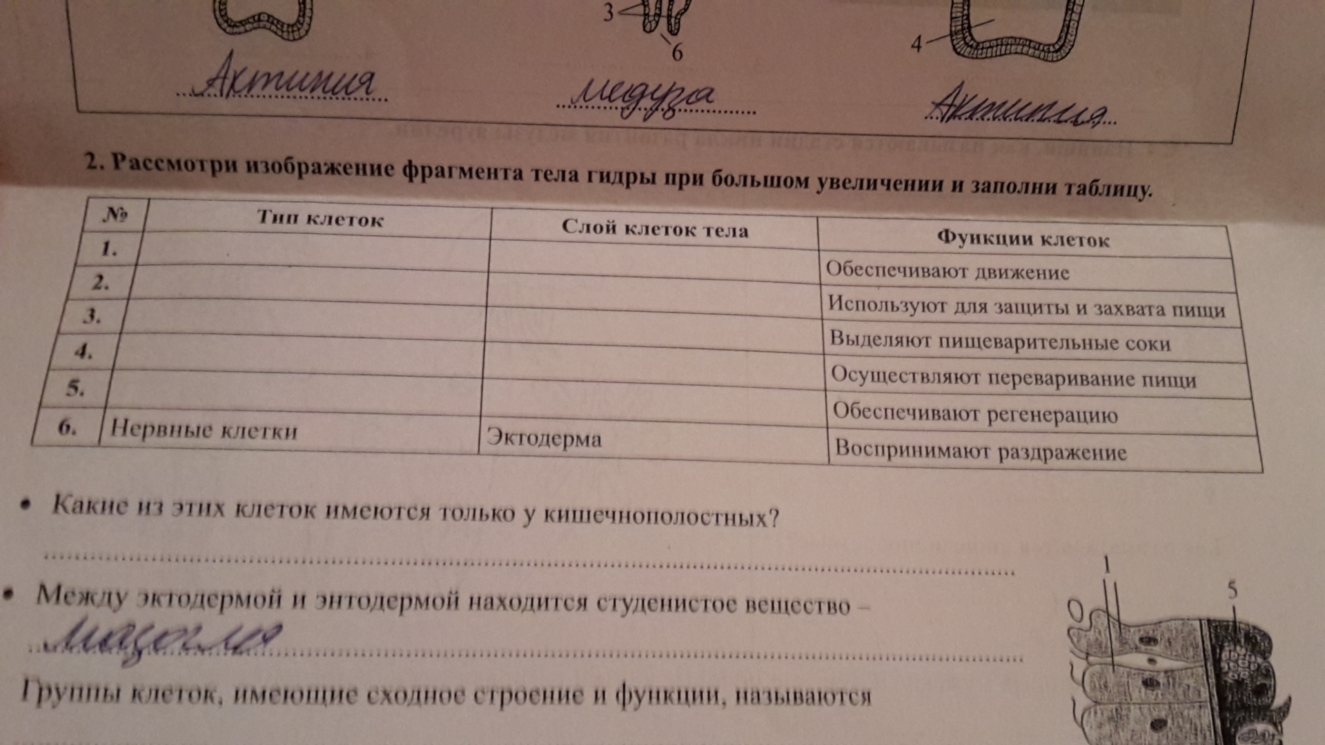 2 стрекательные клетки, эктодермы используются для защиты и захвата пищи