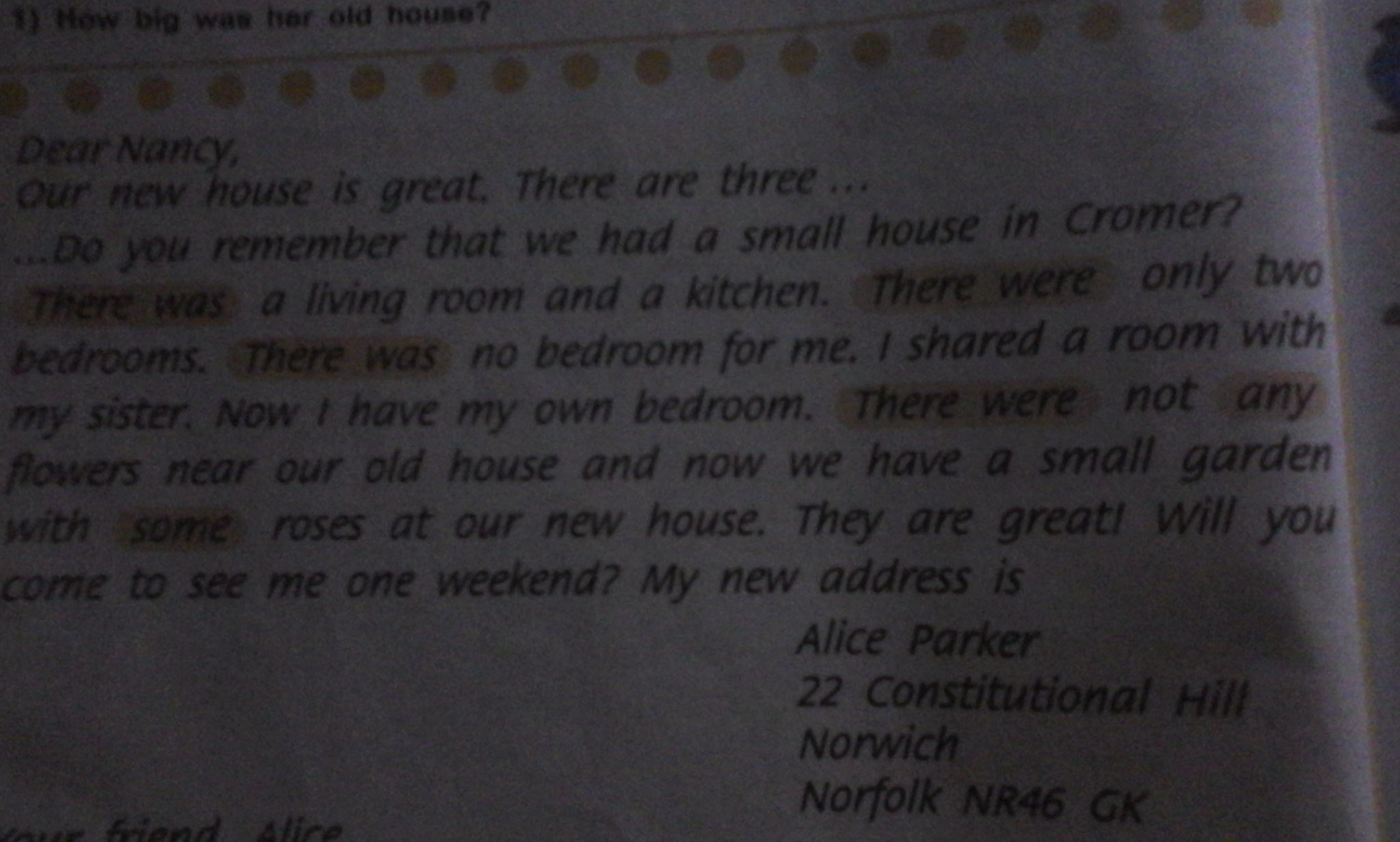 Наш новый дом велик. Есть три ... Вы помните, что у нас был небольшой дом Существовал крыла комната и кухня Были только две спальни. Там не было спальни для меня делил комнату с моей сестрой, скашивают имеют собственную спальню. Там не было никаких полномочий возле нашего ALD дома, и теперь у нас есть небольшой сад-е некоторые розы в нашем новом доме. Они greatl вы пришли ко мне один уик-энд? Мой новый адрес Элис Паркер 22 конституционная Хилл Норидж Норфолк NR46 GK