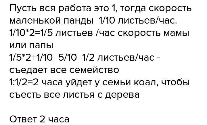 Маленький коала съедает листья с одного эвкалиптового дерева за 10 часов. Его мама и папа едят вдвое быстрее. За сколько времени вся семья съест все листья с одного эвкалиптового дерева?