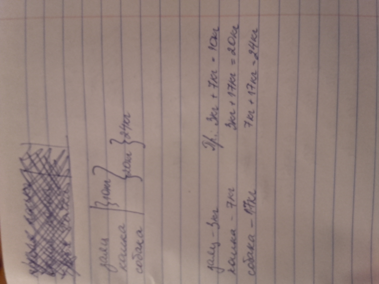 Заяц с кошкой вместе весят 10 кг. Собака с зайцем — 20 кг. Собака с кошкой — 24 кг. А сколько в этом случае будет весить каждый из них?