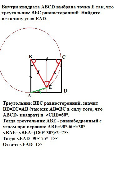 Внутри квадрата ABCD выбрана точка E так, что треугольник BEC равносторонний. Найдите величину угла EAD.