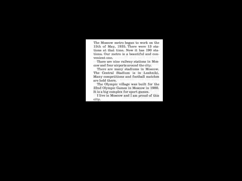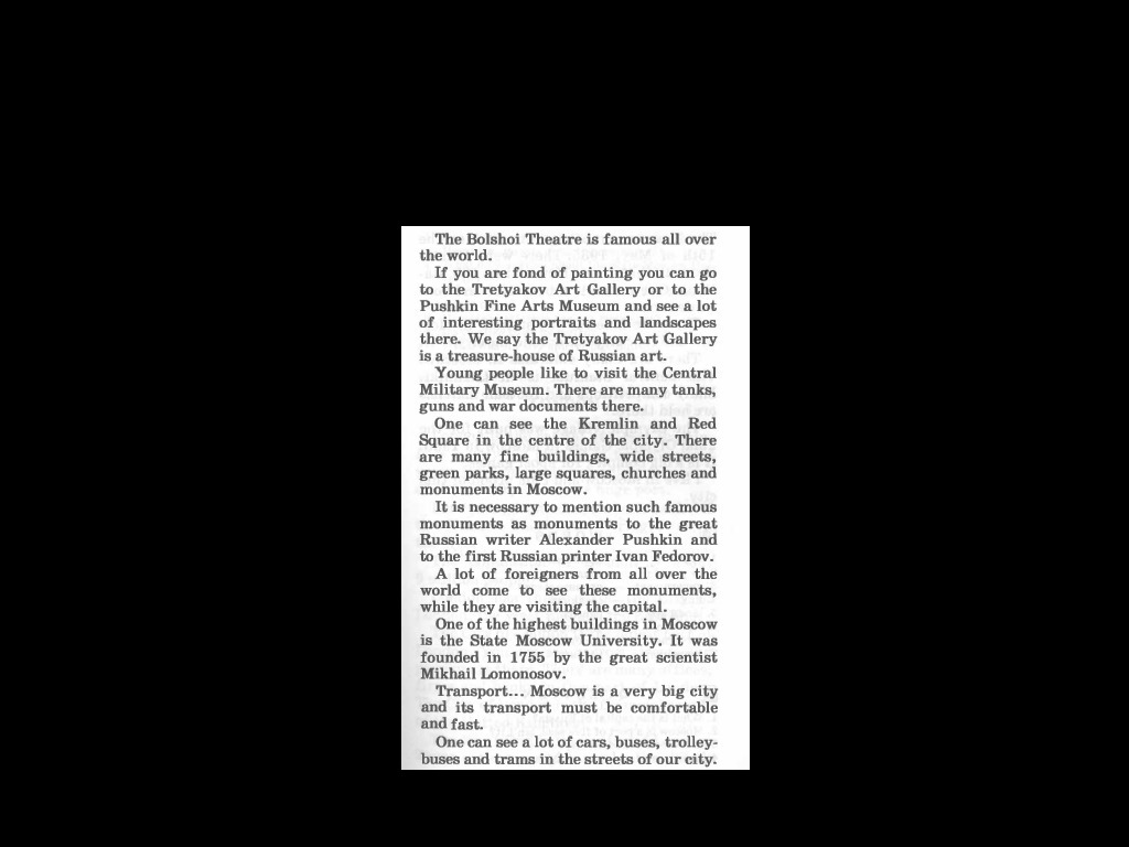 Москва столица России. Это один из самых больших и самых красивых х годов прошлого века горо- в мире. Москва это современный город, в настоящее время. Потен- махинация города составляет около 9,5 миллиона человек. Москва является политическим центром, где правительство нашей страны работает. Москва была основана в 1147 году Юрием Долгоруким. Общая площадь Москвы составляет около девятисот квадратных километров. мы говорим, что Москва является портом пяти морей, как Москва Волга связывает Москву с Балтийского, Белого, Каспийского и Черного морей и Азовского моря. Москва является промышленным центром тоже. Есть много фабрик и заводов там. Один из самых известных растений, наводит грузовики, а другой производит Москва является культурным центром. Есть 60 профессиональных театров, 74 музеев, многие институты и библиотеки в Москве.