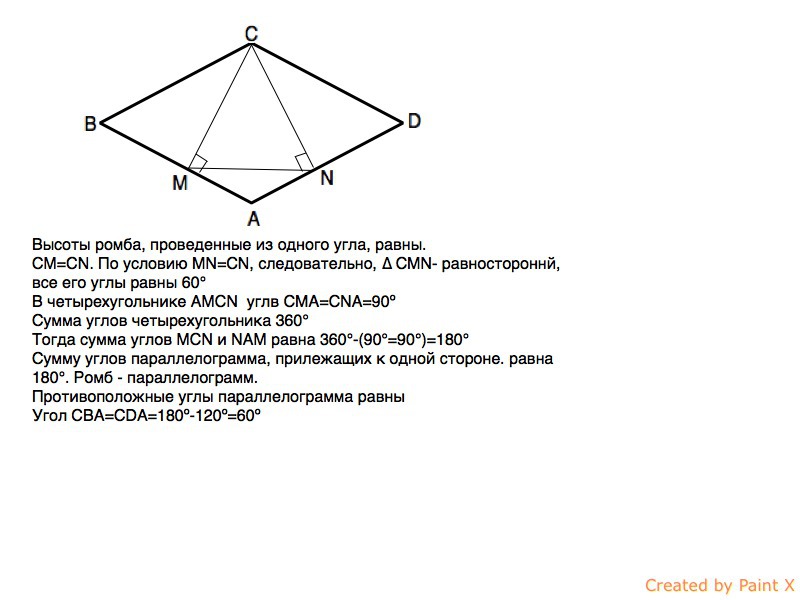 из вершины С тупого угла ромба проведены высоты СМ и СN . Известно, что МN= СМ. Найти углы ромба.