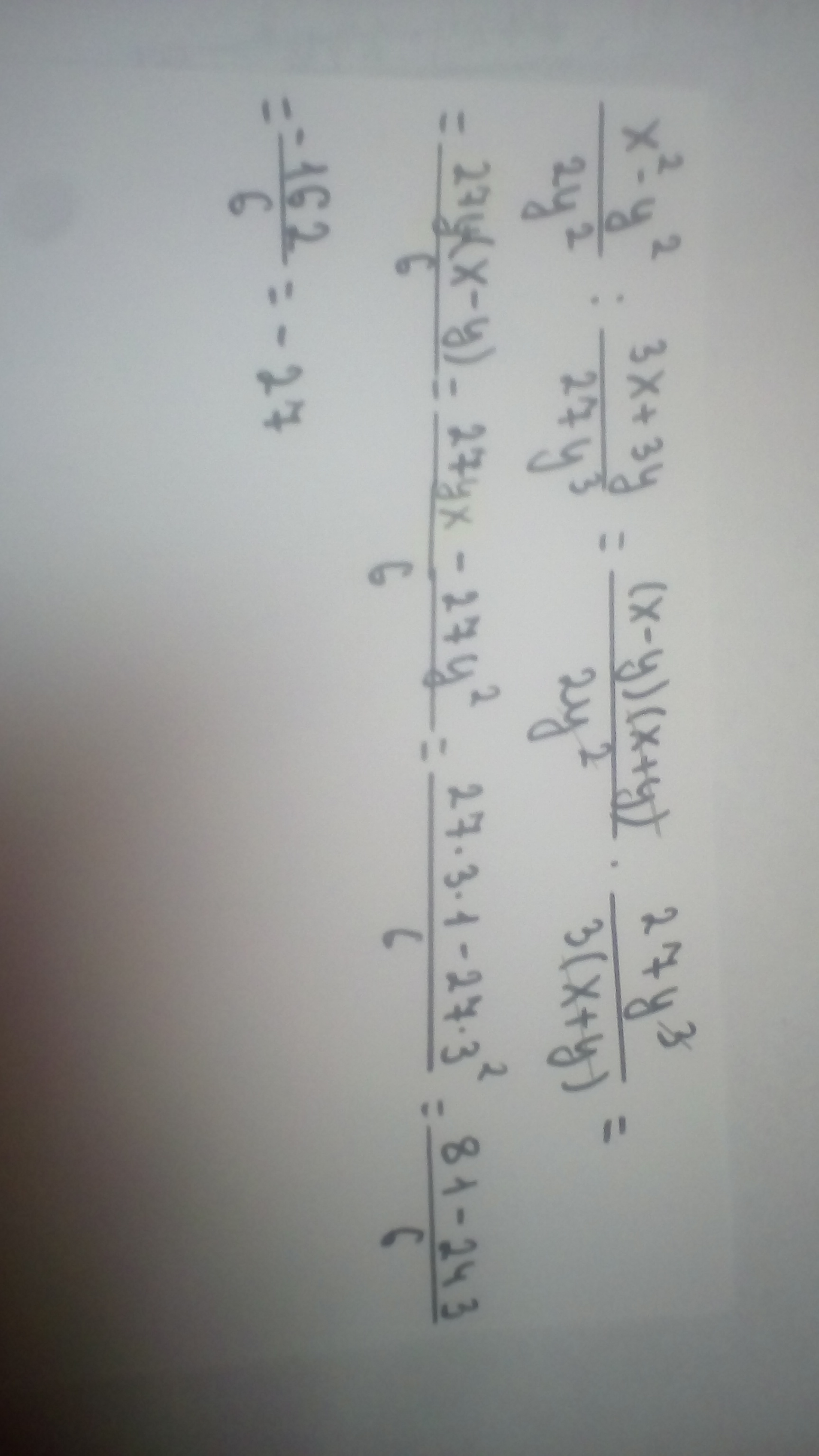 =(x-y)(x+y) /2y² * 27y³/3(x+y) =9y(x-y) /2