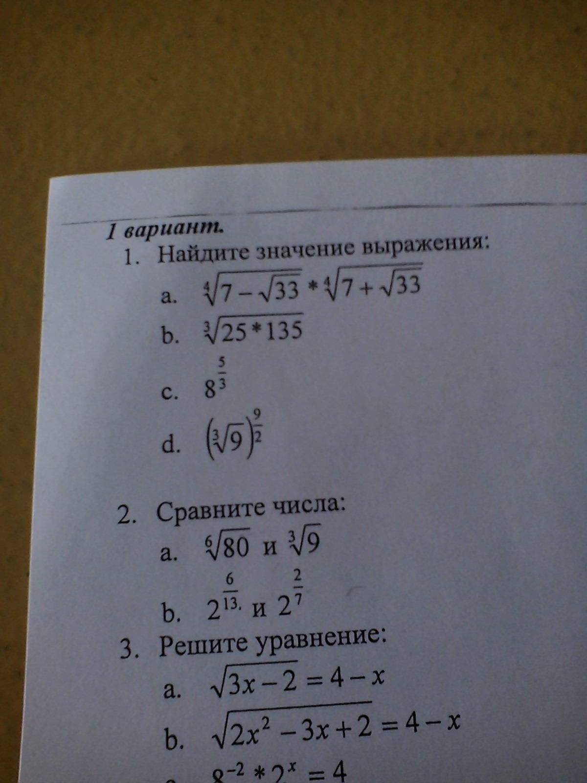 a);sqrt[4]{7-sqrt{33}}cdotsqrt[4]{7+sqrt{33}}=sqrt[4]{(7-sqrt{33})(7+sqrt{33})}=\=sqrt[4]{7^2-(sqrt{33})^2}=sqrt[4]{49-33}=sqrt[4]{16}=pm2\b);sqrt[3]{25cdot135}=sqrt[3]{25cdot5cdot27}=sqrt[3]{125cdot27}=sqrt[3]{5^3cdot3^3}=sqrt[3]{(5cdot3)^3}=15\c);8^{frac53}=8^{frac13cdot5}=left(8^frac13right)^5=left(sqrt[3]8right)^5=2^5=32