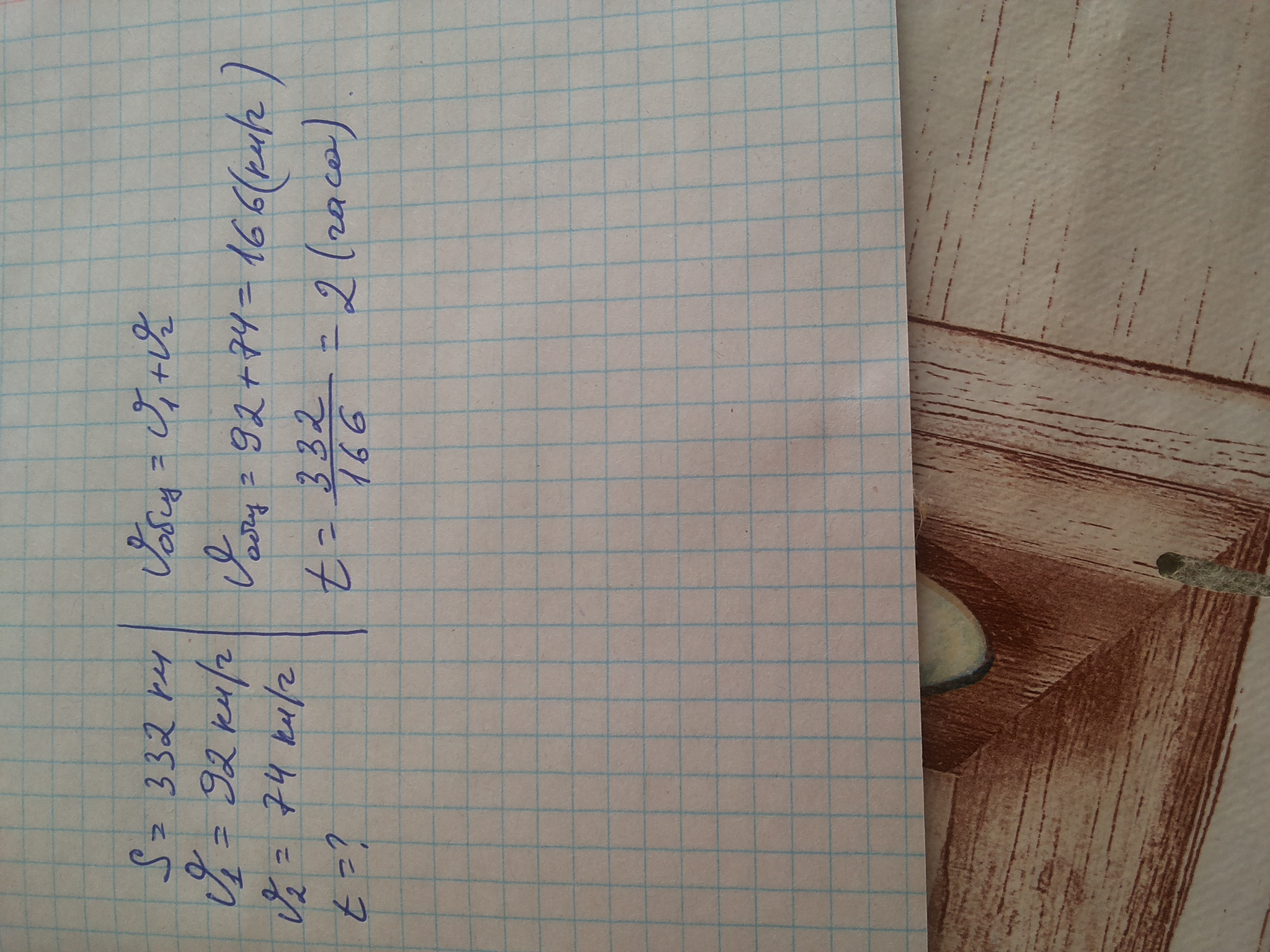 Из пунктов A и B, расстояние между которыми 332 км, одновременно навстречу друг другу выехали автомобилист и мотоциклист. Скорость автомобиля равна 92 км/ч, а скорость мотоцикла равна 74 км/ч.