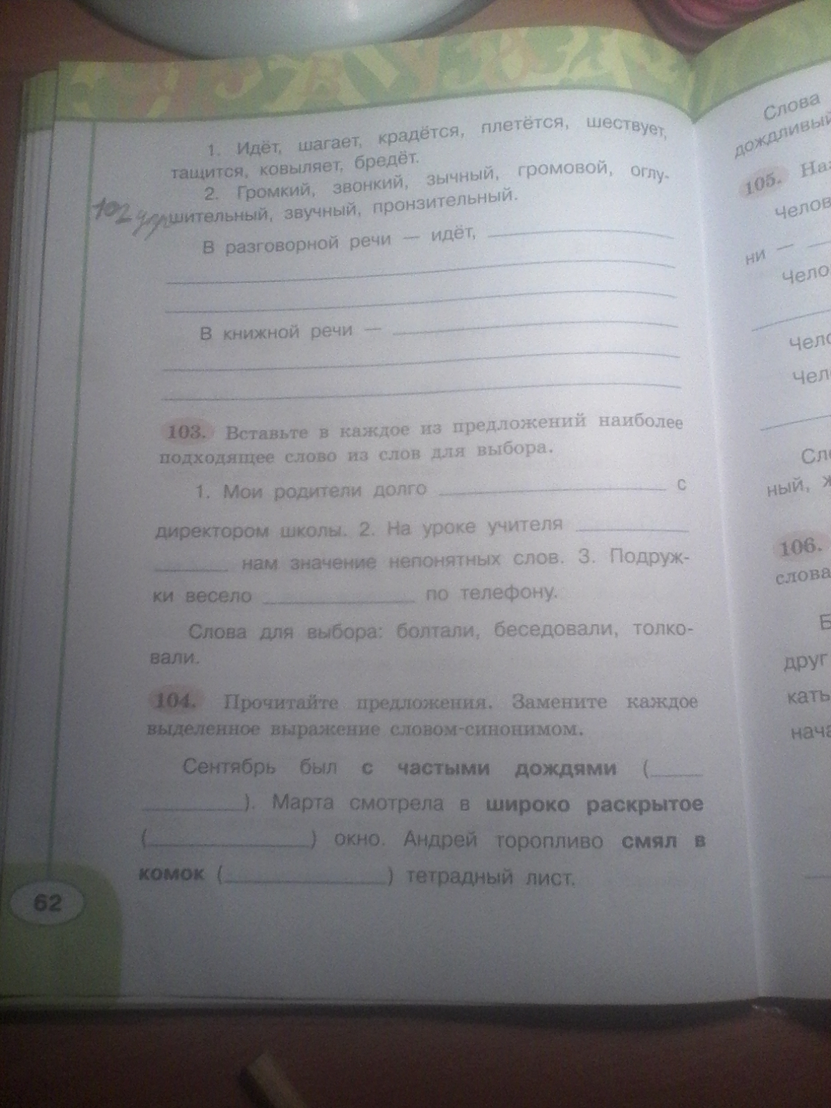 помогите 102 упр там нужно распределить слова в разговорной речи или в книжной речи и 104 упр фото есть 3 класс