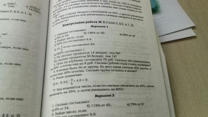 1. а) 3.36 б) 74.8 в) 95а/100=0.95а. 2. а) 100×6.4÷40=16 б) 23×100÷46/15=2300÷46/15=750 в) 100t÷600= 1/6t. 3. 100×14÷ 56= 25 процентов 100-25=85 процентов. Ответ: на 85 процентов 56 больше 14. 4. 1 действие ) 75×20÷100= 15- ето 20 процентов от 75, 2 действие 75-15=60( рубл) - цена после первого подешевения, 3 действие) 0-8=52( рубл.) Ответ : клубника стала стоить 52 рубля. 5. 1 действие 50×30÷100=15(кг) 2 действие 50-15=35(ко) - осталось после первого забора., 3 действие 35×40÷100=14(кг) 4 действие 35-14=21(кг) ответ: остался 21 кг.