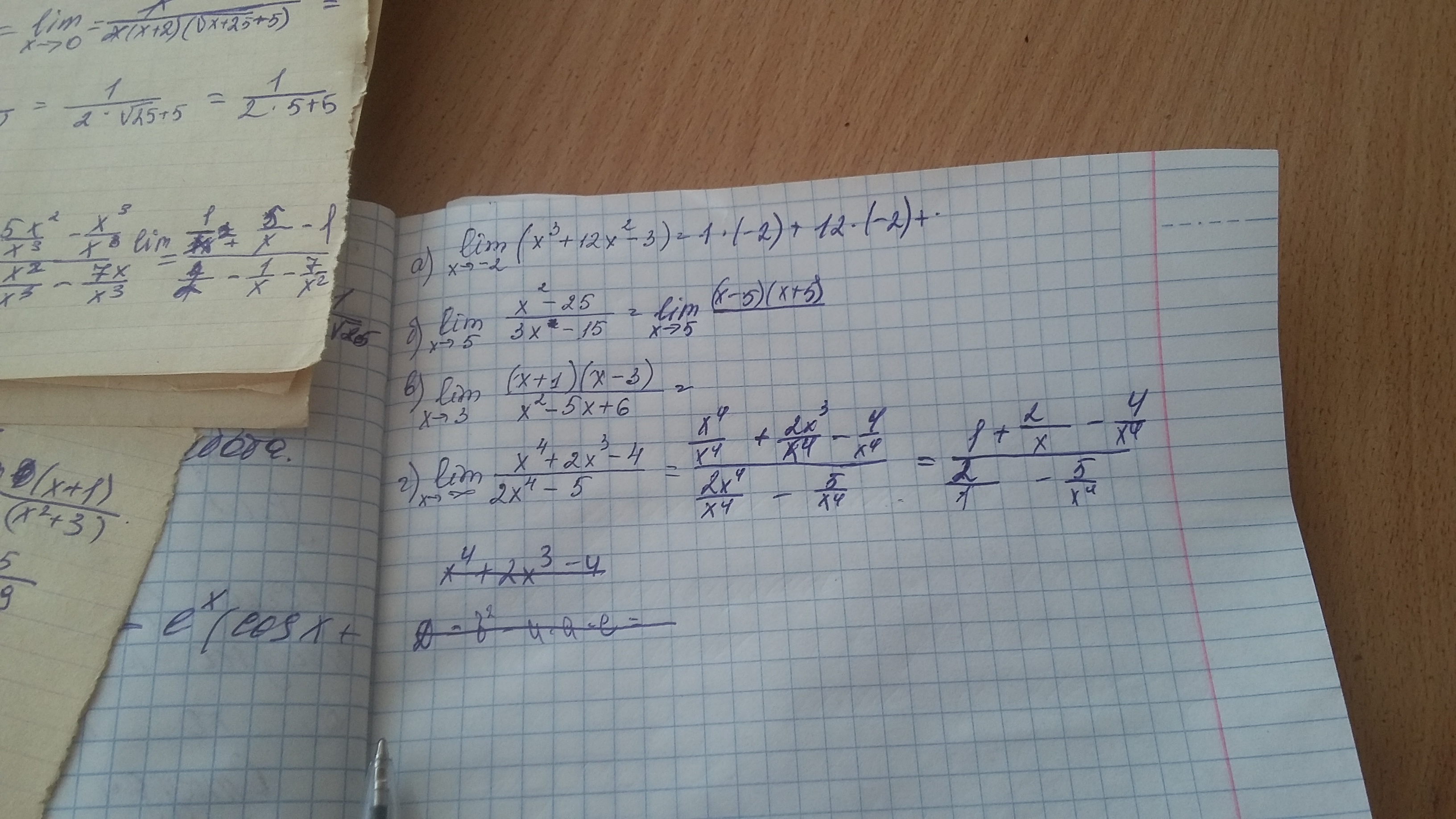 г) ∞/∞ неопределенность чтобы упростить выражение представим в виде суммы lim(x⁴/(2x⁴-5)+(2x³)/(2x⁴-5)-4/(2x⁴-5)) раздели все на x⁴ получим lim (-1/3-(2x)/3+4/(3x⁴)) = ∞
