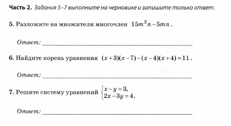5)5mn(3m-1); 6)раскрываем скобки: x2-7x+3x-21-x2+16=11; 4x=16; x=4; 7)выражаем у через 1 уравнение:y=x-3; подставляем во 2: 2x-3-3x+9=4; x=6-4=2; y=2-3=-1;