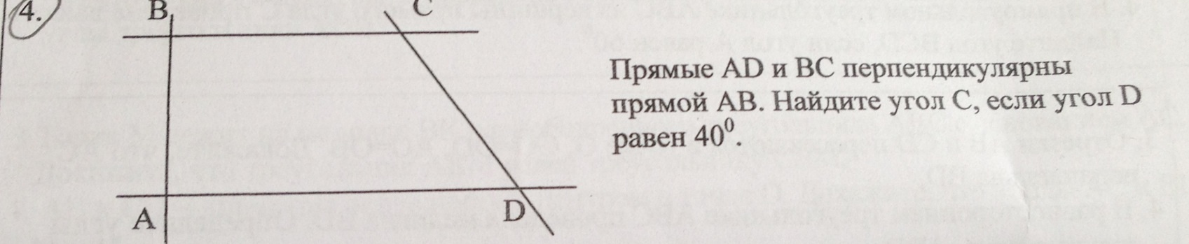 Прямые AD и BC перпендикулярны прямой AB. Найдите угол С если угол D равен 40 градусов