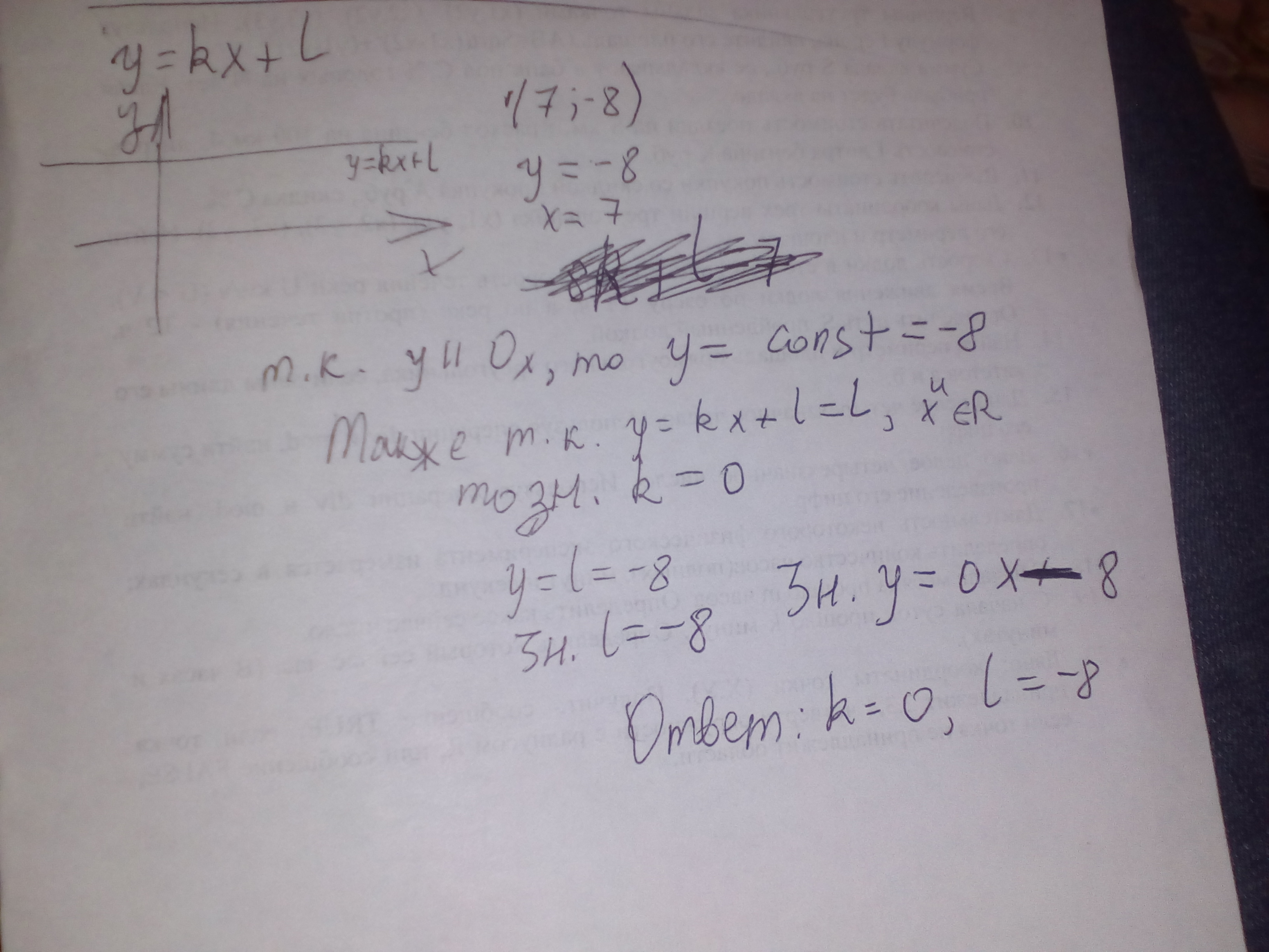 Известно что график функции y=kx+l параллелен оси абцисс и проходит через точку (7, -8).Найдите k и l