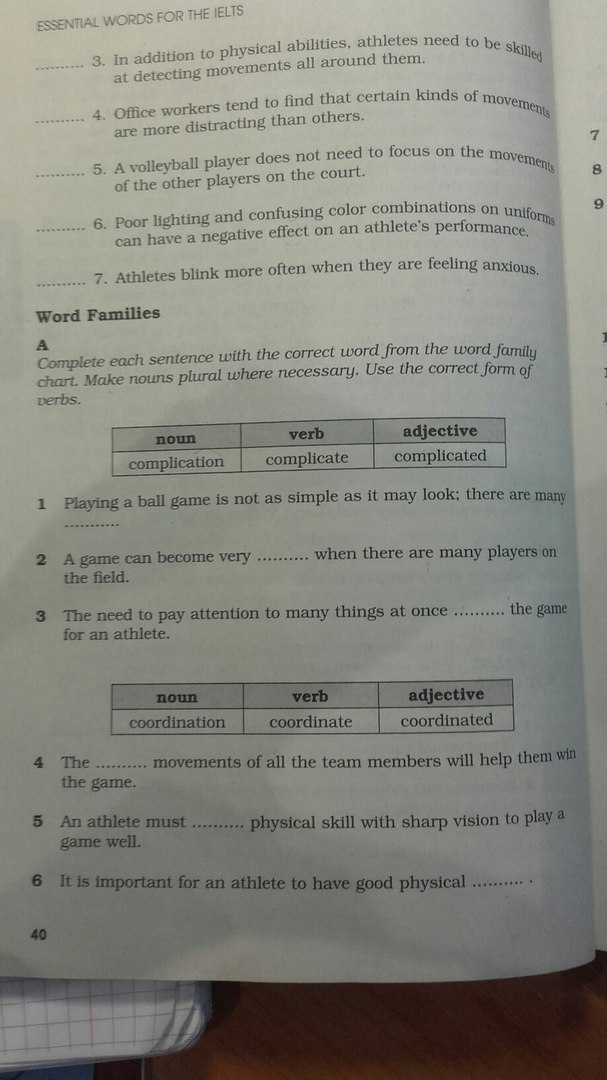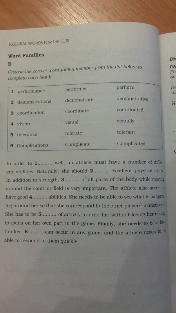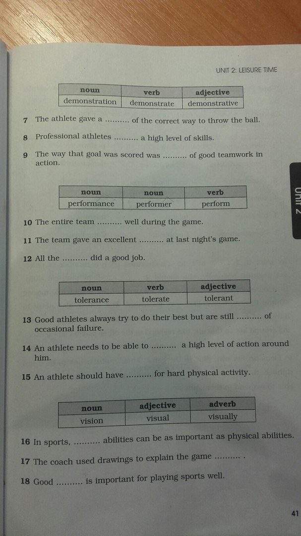 B) 1. Perform, 2. Demonstrate 3. Coordination 4. Visual 5. Tolerant 6. Complications A) 1. Complications 2. Complicated 3. Complicates 4. Coordinated 5. Coordinate 6. Coordination 7. Demonstration 8. Demonstrate 9. Demonstrative (хотя я бы лучше сказала a demonstration, но уже слово занято) 10. Performs или performed если в прошлом 11. Performance 12. Performers 13. Tolerant 14. Tolerate 15. Tolerance 16. Visual 17. Visually 18. Vision