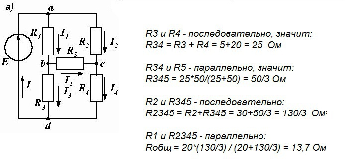 Эти задачи решаются постепенным упрощением схемы: - 2 последовательных соединенных резистора, например R6 и R7, заменяют на один сопротивлением R67=R6+R7