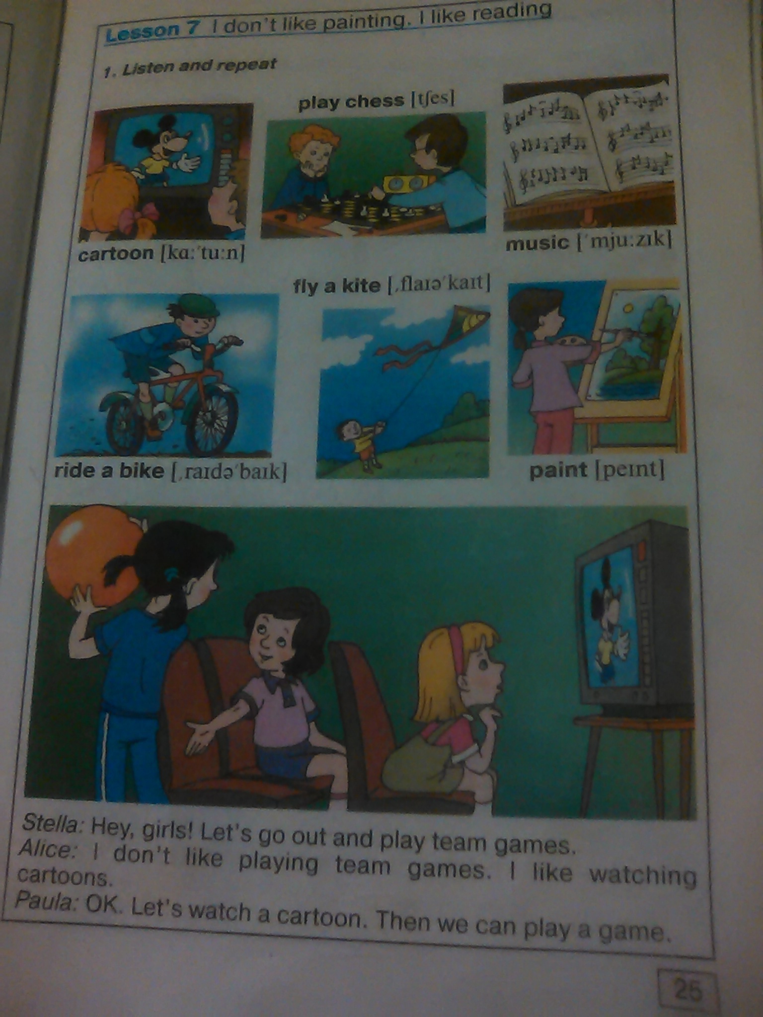 1)I watch cartoons.2)I play chess 3)I listen to music 4)I ride a bike 5)I shoot a fly snake 6)I draw paint