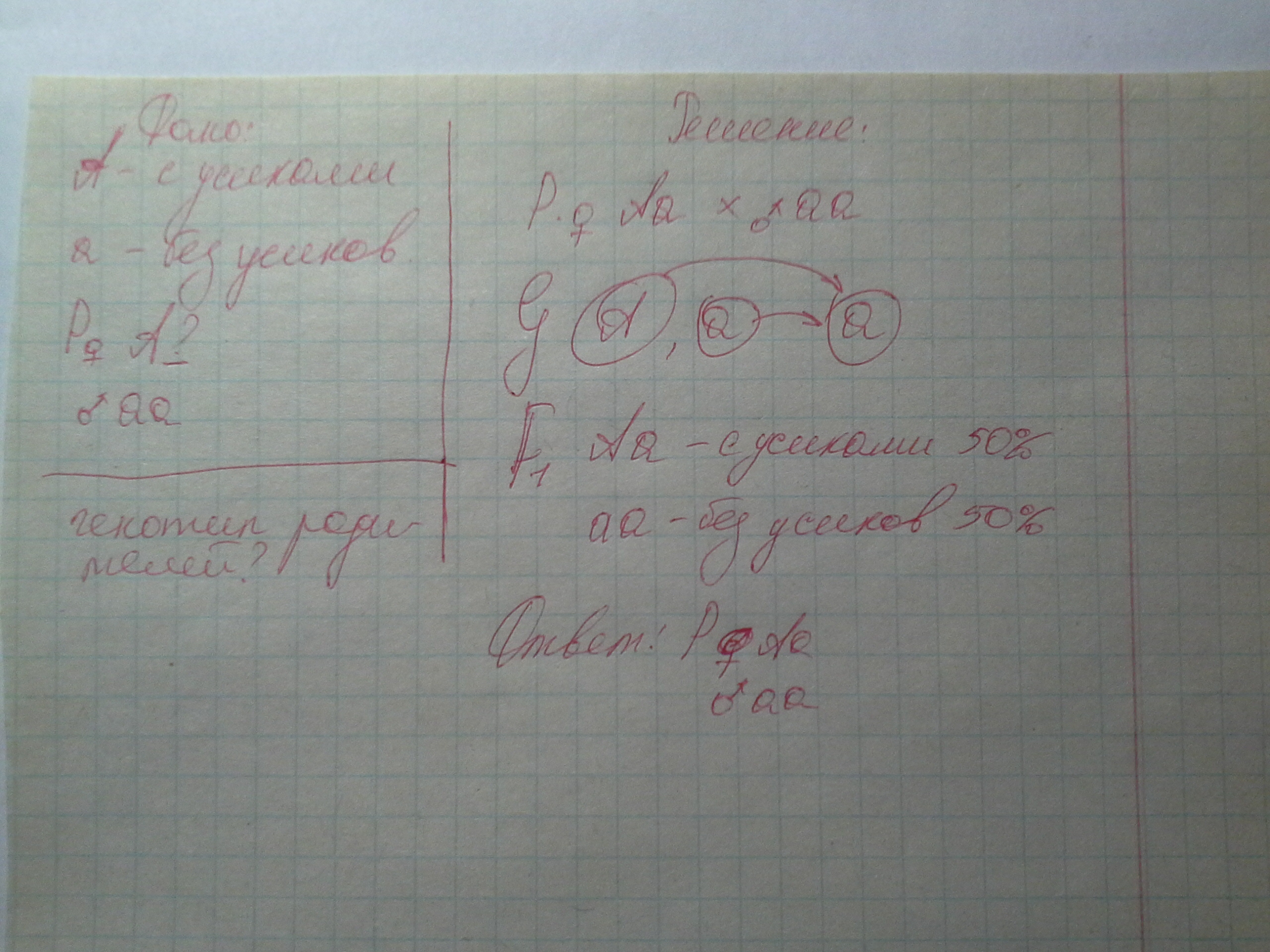 Скрестили горох с усиками (доминантный признак) и горох без усиков(рецессивный) Какой генотип родителей, если в потомстве по фенотипу соответствие 1:1?(если не трудно то с полным решением )