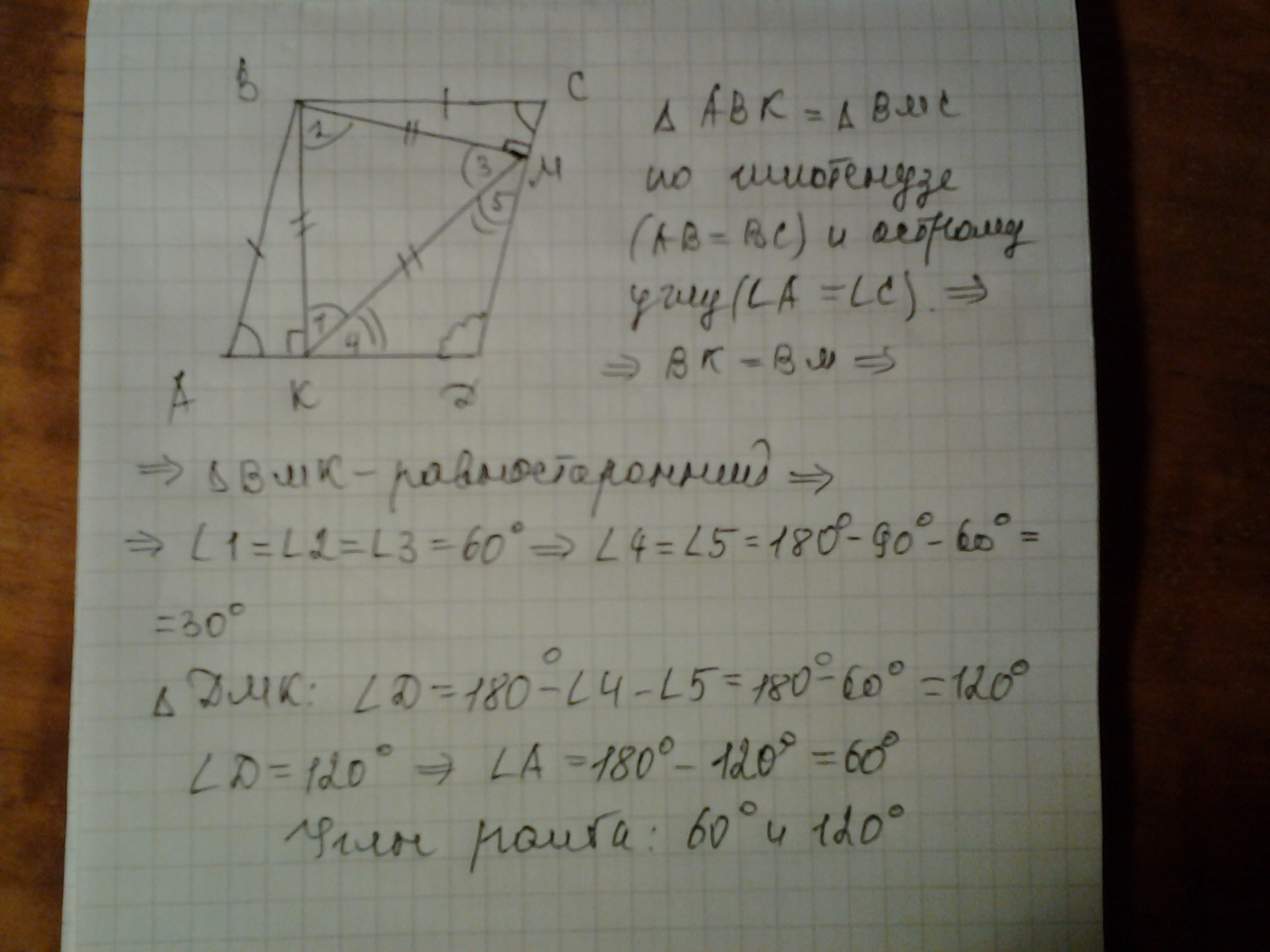 С вершины B тупого угла ромба ABCD проведены высоты BK и BM, известно что КМ = ВК. Найти уголы ромба