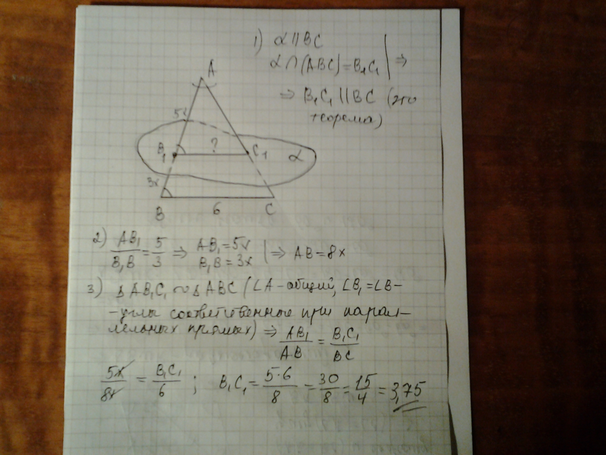 Плоскость,параллельная стороне BC треугольника ABC,пересекает стороны AB и AC в точках B1 и C1 соответственно,причем AB1:B1B=5:3.Найти B1C1,если BC=6 см.Помогитееееееееееееееееее
