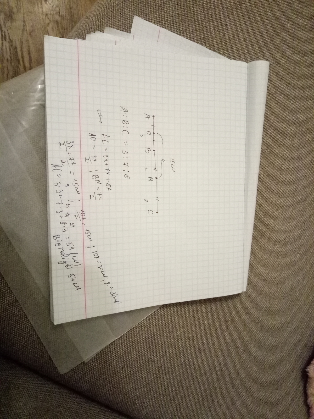 відрізок поділили на частини у відношенні 3:7:8. відстань між серединами перших двох частин дорівнює 15 см. знайти довжину даного відрізку