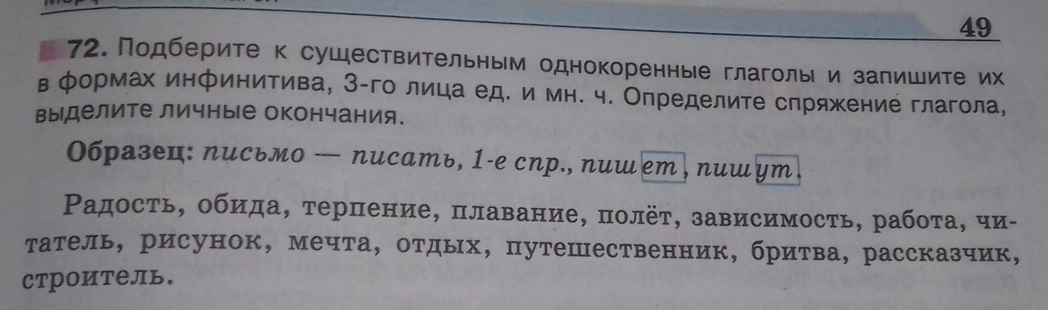 1)радость - радовать, 1 спр., радует, радуют; 2)обида - обижать - обидеть, 1 спр., обижает, обижают; 3)терпение - терпеть, 2 спр., терпит, терпят; 4)плавание - плавать, 1 спр., плавает, плавают; 5)полёт - летать, 1 спр., летает, летают; 6)зависимость - зависеть, 2 спр., зависит, зависят; 7)работа - работать, 1 спр., работает, работают; 8)читатель - читать, 1 спр., читает, читают; 9)рисунок - рисовать, 1 спр., рисует, рисуют; 10)места - мечтать, 1 спр., мечтает, мечтают; 11)отдых - отдыхать, 1 спр., отдыхает, отдыхают; 12)путешественник - путешествовать, 1 спр., путешествует, путешествуют; 13)братва - брить, 1 спр., бреет, бреют; 14)рассказчик - рассказать, 1 спр., рассказывает, рассказывают; 15)строитель - строить, 2 спр., строит, строят