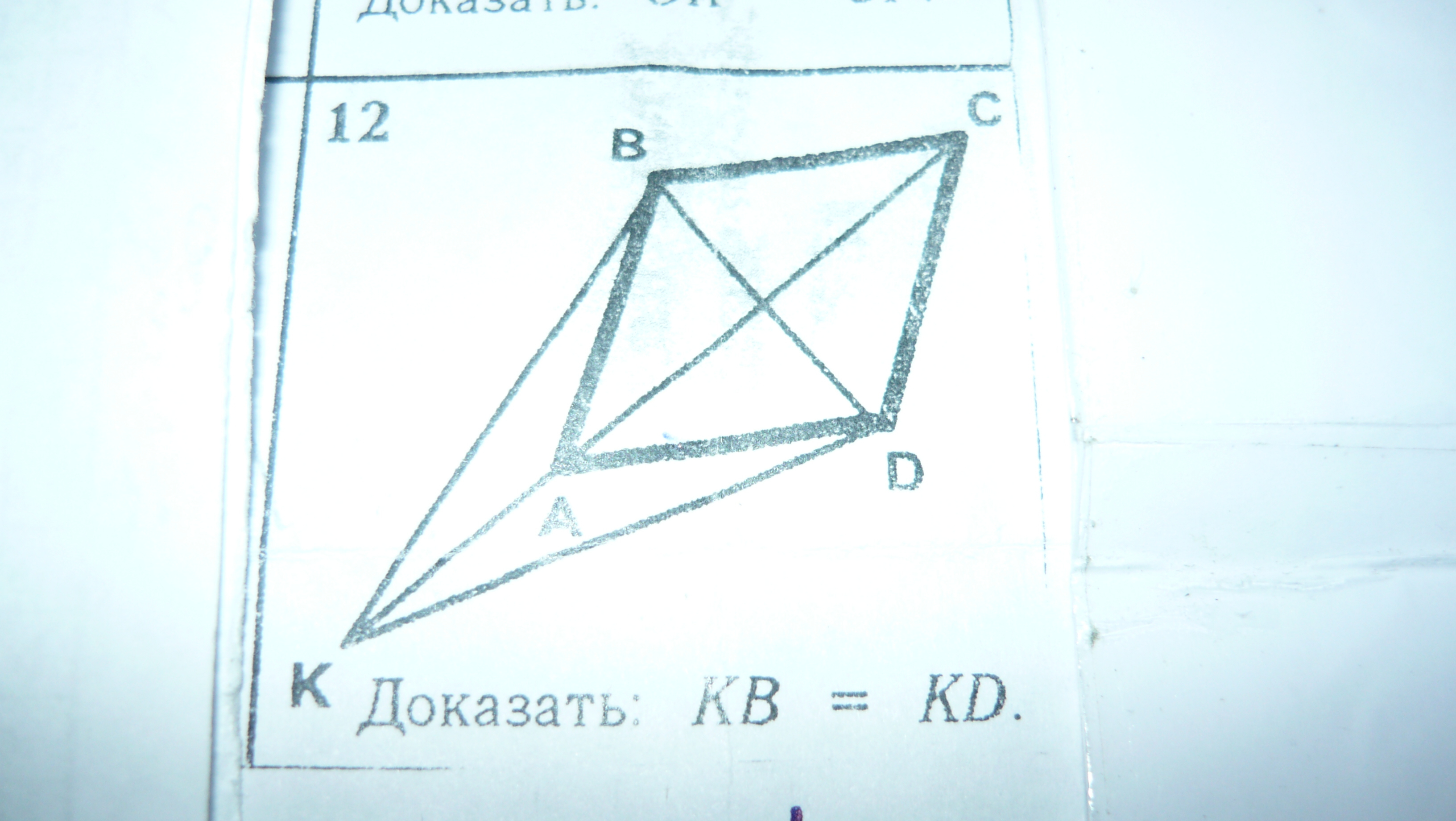 AB=AD и сторона КА общая.Следовательно треугольники KBA и KDA равны по 2 сторонам и углу между ними.Значит равны и стороны KB и KD/
