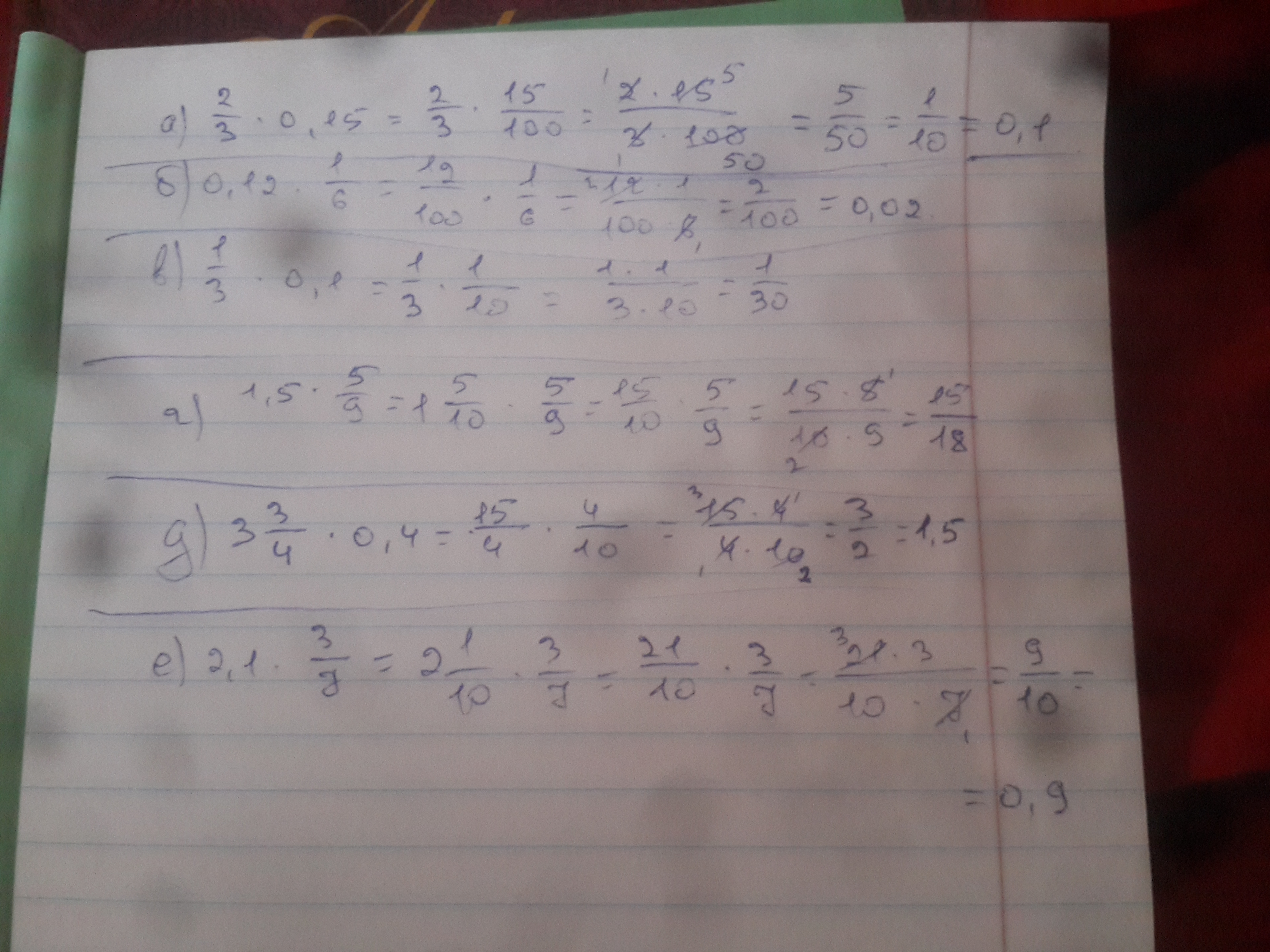 обратите десятичнуюдробь в обыкновенную и выполните умножение.Представьте ответ,если возможно,в виде десятичной дроби. а) 2/3*0,15 б)0,12*1/6в)1/3*0,1г)1,5*5/9д)3 .3/4*0,4е)2,1*3/7 пж с решением