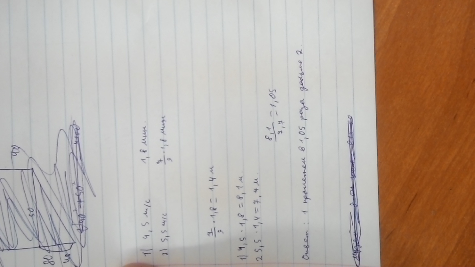 При испытании афиамоделей одна из них развила скорость 4,5 метров в секунду и держалась в воздухе 1,8 мин. Скорость 2 была на 1 м секунду больше скорости