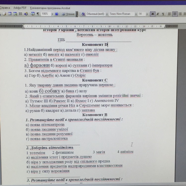 Блок Д : 1 палеолит . 2 фараон . 3 анубис . Блок С : 1 собаку . 2 Рамзес 2 (не уверен) 3 рукав . Блок С : 1 австралопитек . питекантроп . человек умелый . человек разумный . 2 тотемизм-а . фетишизм -в . магия - г . анимизм - б ( в этом задании не уверен . просто я не знаю Украинского )