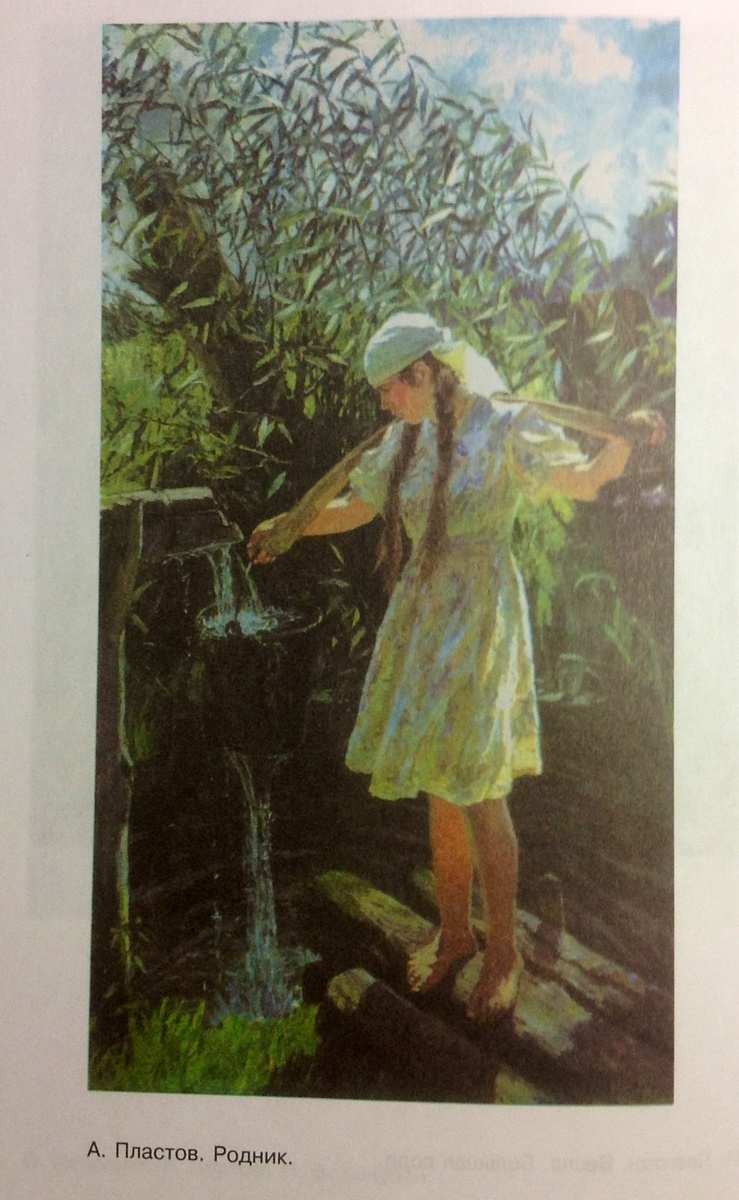Перед нами картина замечательного художника - А. Пластова "Родник". Основной тон этой картины - зеленый, цвет символизирующий свежесть , обновление, и придающий особое ощущение тепла. Ах, как иногда не хватает именно такой погоды - солнечной, радостной, и , видя такой освежающий, холодноватый родник, невозможно не восхититься им, чудесным источником жизнерадостности, светлых мыслей. И девушка, похоже, с удовольствием набирает в свое ведро эту кристально- чистую воду... Обратим внимание на выражение лица этой девушки- оно светлое, лучистое, словно впитало в себя красоту окружающего мира.