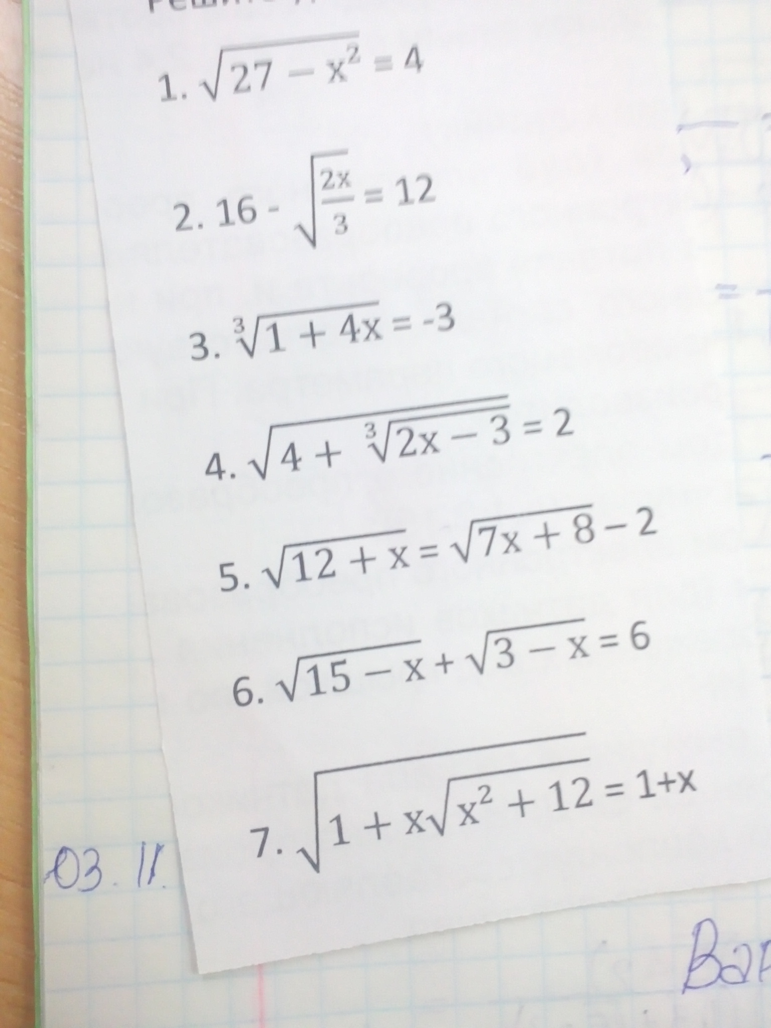 1) возводим обе части уравнения в квадрат: 27-x^4=16