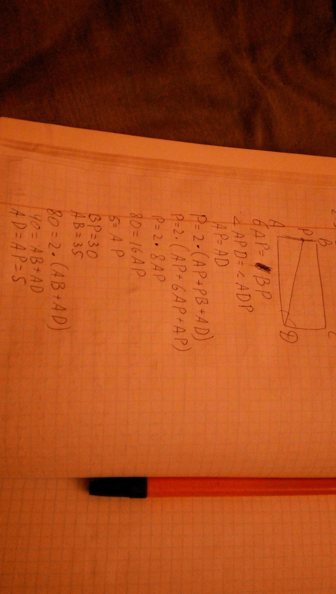 В прямоугольнике ABCD биссектриса угла D пересевает сторону AB в точке Р. Отрезок АР меньше отрезка ВР в 6 раз. Найдите стороны прямоугольник, если его периметр равен 80 см.