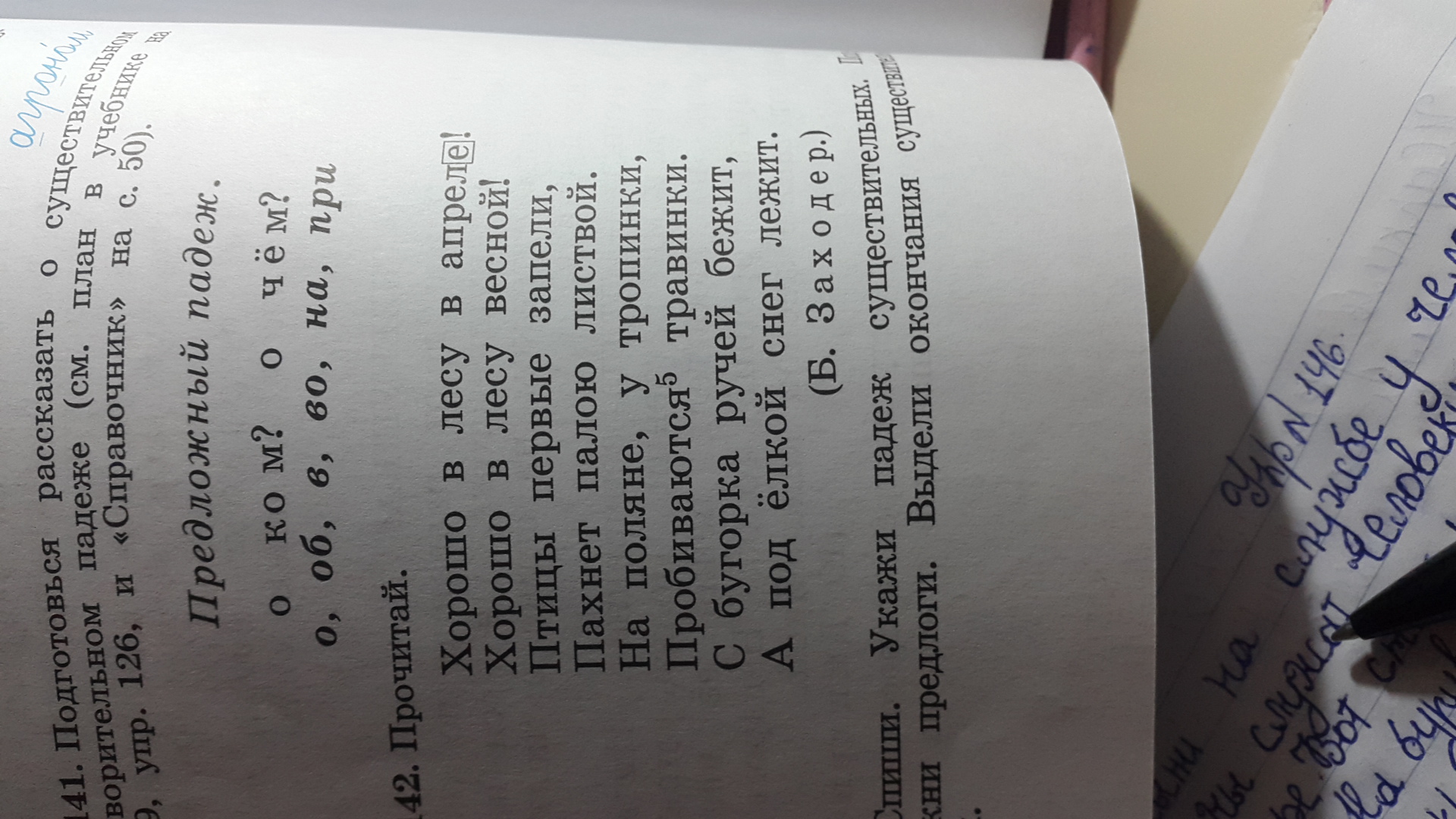 в лесу-д,в апреле-п.,весной-т,птицы-и,листвой- т,на поляне-п , у тропинки-р, тропинки-и,с бугорка-р, ручей-и,ёлкой -т, снег-и