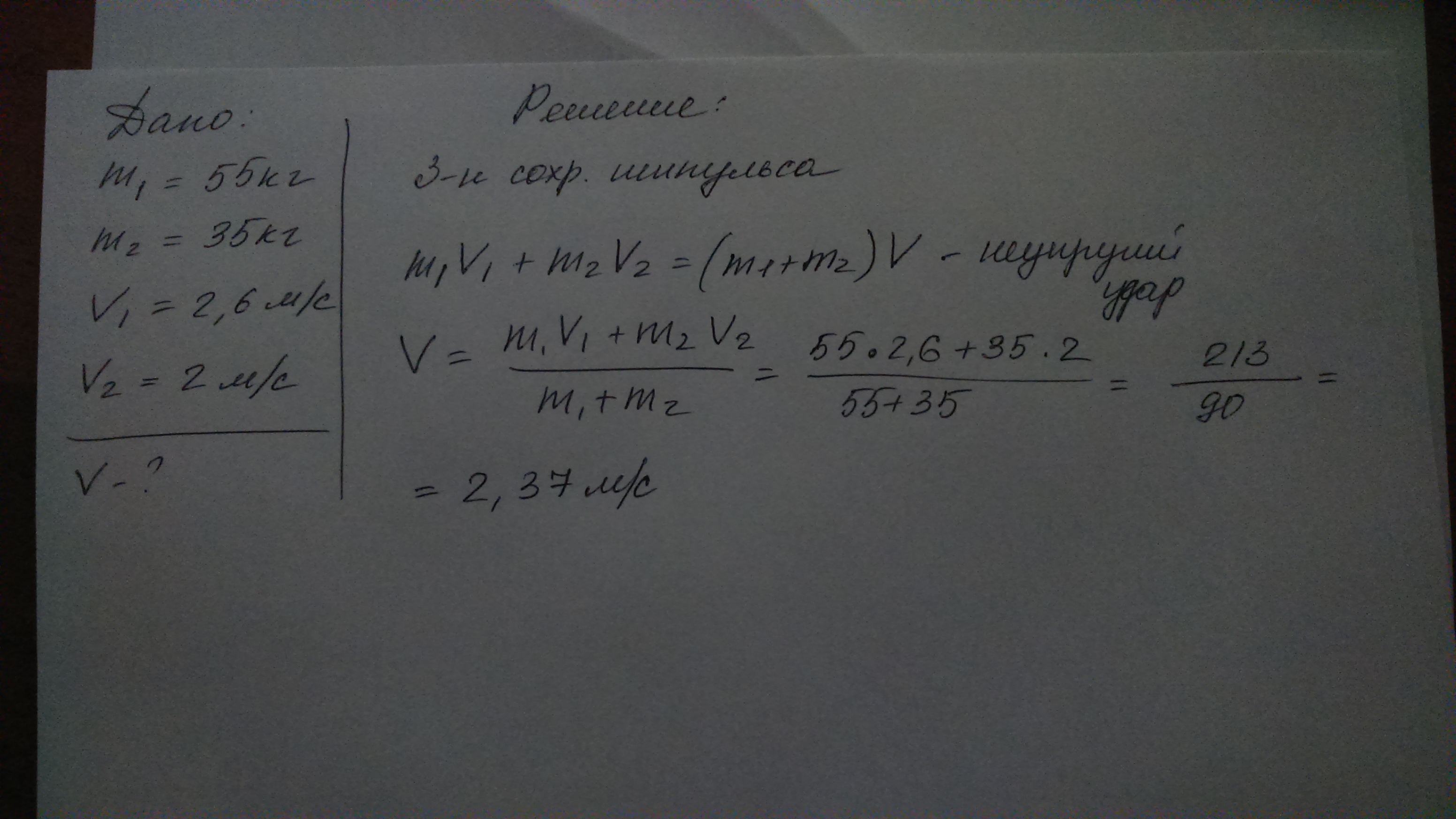 Человек массой 55 кг, бегущий со скоростью 2,6 м/с, догоняет тележку массой 35 кг, движущуюся со скоростью 2 м/c, и вскакивает на нее. С какой скоростью станет двигаться тележка после этого?