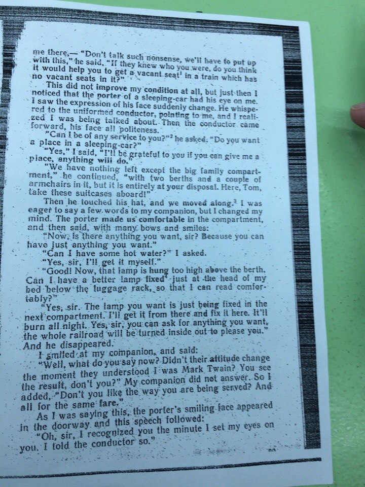 меня там, - "Не говори такую чушь, что нам придется мириться с этим," сказал он "Если бы они знали, кто вы такой, как вы думаете, что это поможет вам получить вакантный море в поезде, который имеет нет свободных мест в нем? " Это не улучшило мое состояние на всех, но только тогда заметил, что привратник спящего-кара был его взгляд на меня. я увидел выражение его лица внезапно измениться.. Он whispe- красный на униформе проводник, указывая на меня, и я REA зет я был говорил о Тогда проводник вышел вперед, его лицо все вежливость. "Может Ibe каких-либо услуг для вас?" 2 спросил он. Есть ли у вас место в спальном вагоне? "Да," сказал я, ничего wiй сделать. "Благодарны вам, если вы можете дать мне место," У нас не осталось ничего, кроме большой семьи Compart ния ", продолжил он с двумя причалы и пару кресел в нем, но это полностью в вашем распоряжении нere, Том взять их на борт чемоданов Затем он коснулся его шляпу, и мы двинулись вперед. Я очень хотел бы сказать несколько слов своему спутнику, но Ichanged мой разум. швейцар заставил нас комфортно в купе, а затем сказал, со многими поклонами и улыбками: Теперь есть все, что вы хотите, сэр Потому что вы можете иметь только что вы хотите?. "Могу ли я иметь горячую воду? Спросил я. "Да, сэр, я получу это сам." Хорошо теперь, что лампа висела слишком высоко над причалом. Во главе моего могу я лучше лампа фиксированной кровать под буксирный стойку, так что я могу читать Comfor закрепляются в Aves, сэр. TAMP вы хотите просто я получить его оттуда и исправить его здесь. это будет отделению рядом гореть всю ночь. Да, сэр, вы можете просить все, что вы хотите, чтобы вся железная дорога будет вывернута наизнанку, чтобы порадовать вас и он исчез улыбнулся моему спутнику, и сказал:.. Didn'ttheirаftitude изменить "Ну, что вы теперь скажете? понял, я был Марк Твен? Вы видите момент они результатом, не так ли? "Мой спутник не ответил. Так добавил:" Вам не нравится, как вы обслуживаются? И все по той же платы за проезд улыбающееся лицо появилось Как я уже говорил это, привратник последовало: в дверях и этой речи OHN сэр Я узнал вас в ту же минуту я поставил мои глаза на вас я сказал проводник