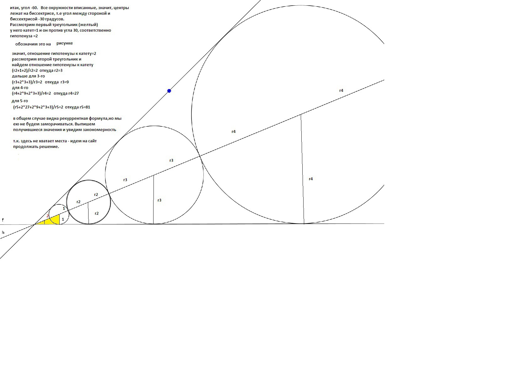Окружность радиуса 1 вписана в угол величиной 60o. Далее вписаны еще 62 окружности. При этом, окружность касается (для от 2 до 63). Известно, что никакие две окружности не свпадают. Вычислите произведение радиусов.