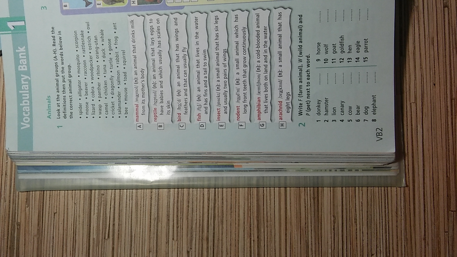 рептилии hreptail / (п): животное, которое откладывает яйца, чтобы иметь детей, и которые, как правило, имеет весы на своей птицы кожа / b2 (п): животное, которое имеет крылья и перья, и которые обычно могут летать рыбы / FLL (п): в животное, которое живет в воде и имеет плавники и хвост, чтобы плавать E насекомых hnsekt / (N): небольшое животное, которое имеет шесть ног и обычно две пары крыльев грызуна / Roud нт / (п): небольшое животное, которое уже давно передние зубы, которые непрерывно растут в амфибию lamfibranl (N): хладнокровное анима, которая живет как на суше, так и в воде H паукообразных loreknid (п): небольшое животное, ха-восемь ног 2 Написать F (сельскохозяйственных животных), W ( диких животных) и P (нетто) рядом с каждым словом
