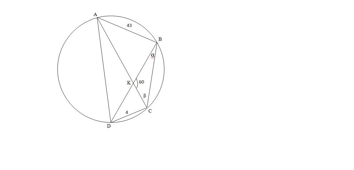 Вокруг выпуклого четырёхугольника ABCD описана окружность. К - точка пересечения диагоналей данного четырёхугольника. Угол ВKС = 60 градусов, АВ = 43, DС = 4. Найти радиус описанной окружности.