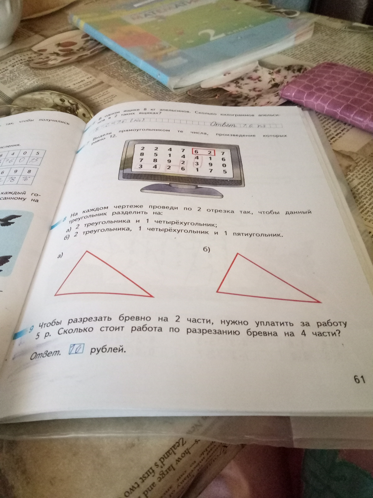 на каждом чертеже проведи по два отрезка так чтобы данный треугольник разделить на 2треугольника,1четырехугольник и 1пятиугольник
