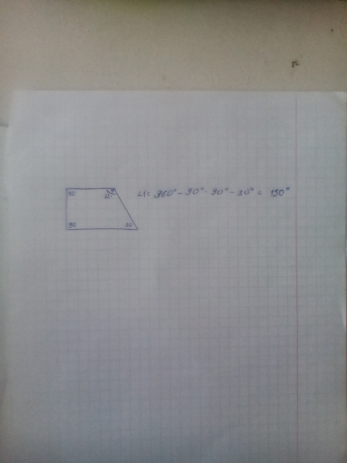 Это прямоугольная трапеция и посколько она прямоугольная то два два угла ее по 90° (иначе условия про прямоугольную трапецию)( вот я и подсказала два угла). Есть еще один известный угол 30° и с этими данными можно его найти. У трапеции как и у всех четырехугольгиков сумма углов 360° а значит (смотри фото сверху)