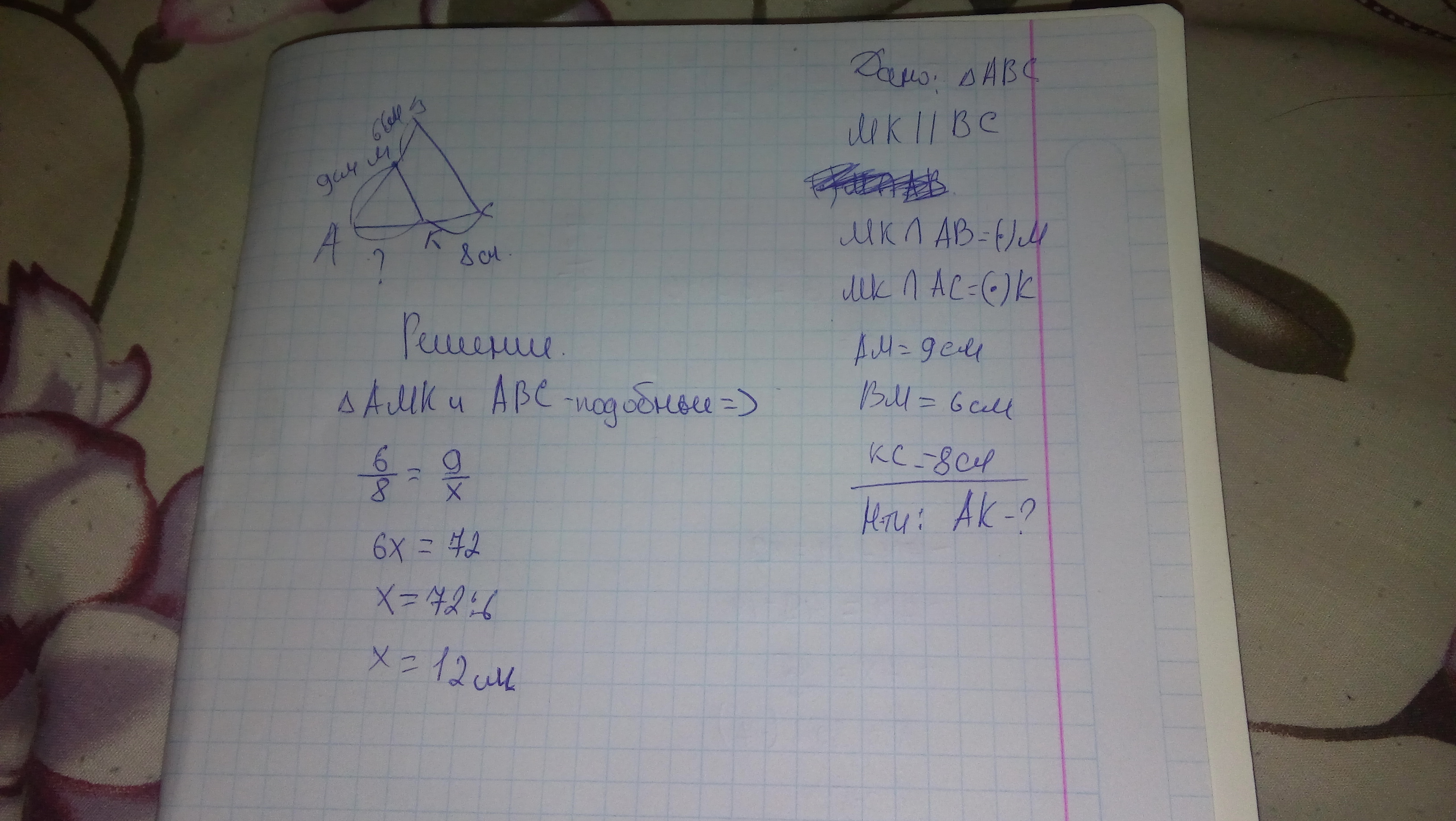 Прямая параллельная стороне ВС треугольника АВС пересекает его сторону АВ в точке М, а сторону АС в точке К, АМ-9см ВМ-6см КС-8см. Найдите отрезок АК. Пожалуйста скорее.