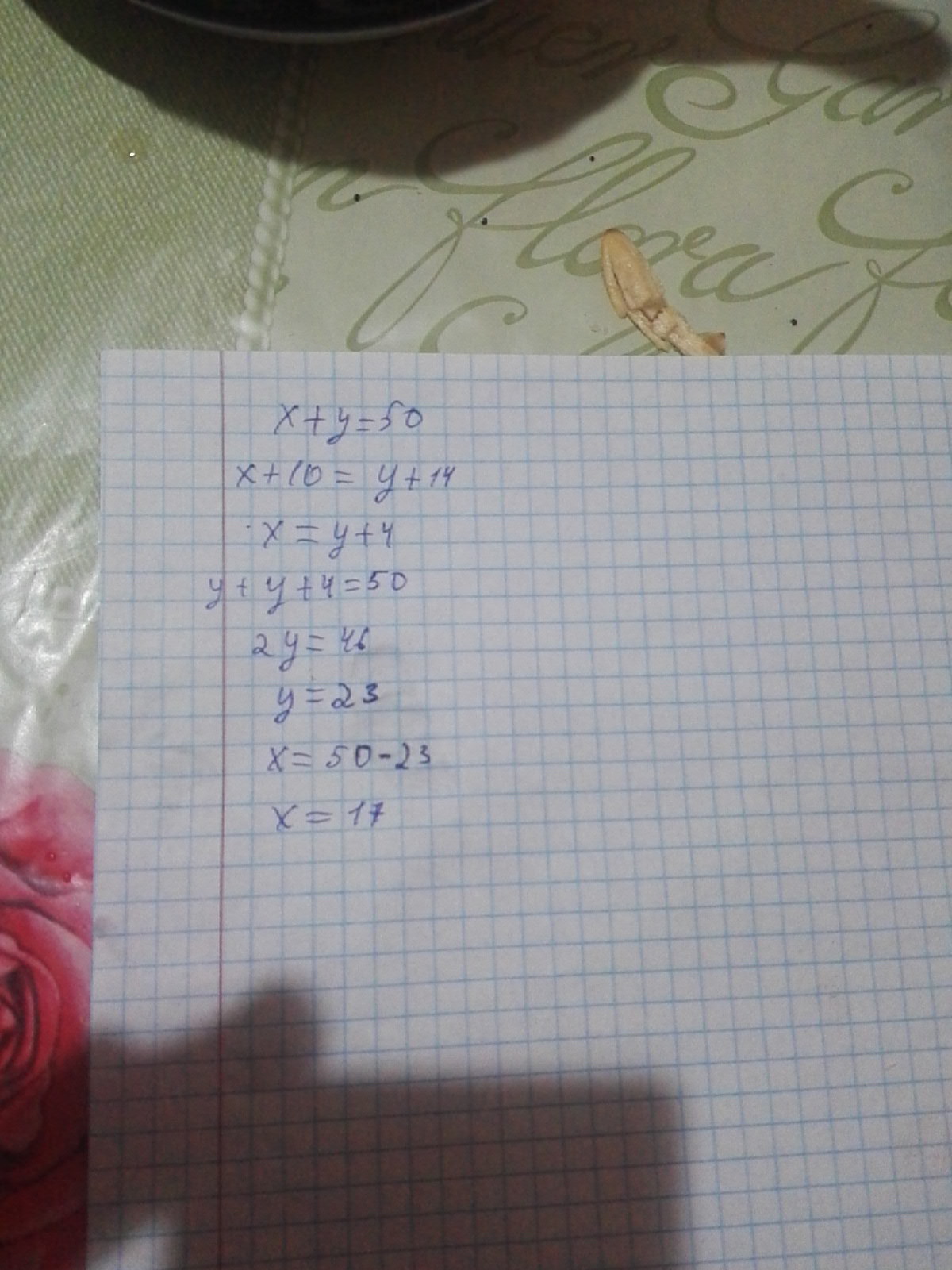 в двух стопках 50 тетрадей . Когда в первую стопку положили 10 тетрадей ,а во вторую 14 тетрадей , то в стопках стало тетрадей поровну .Сколько тетрадей было в каждой стопке первоночально?