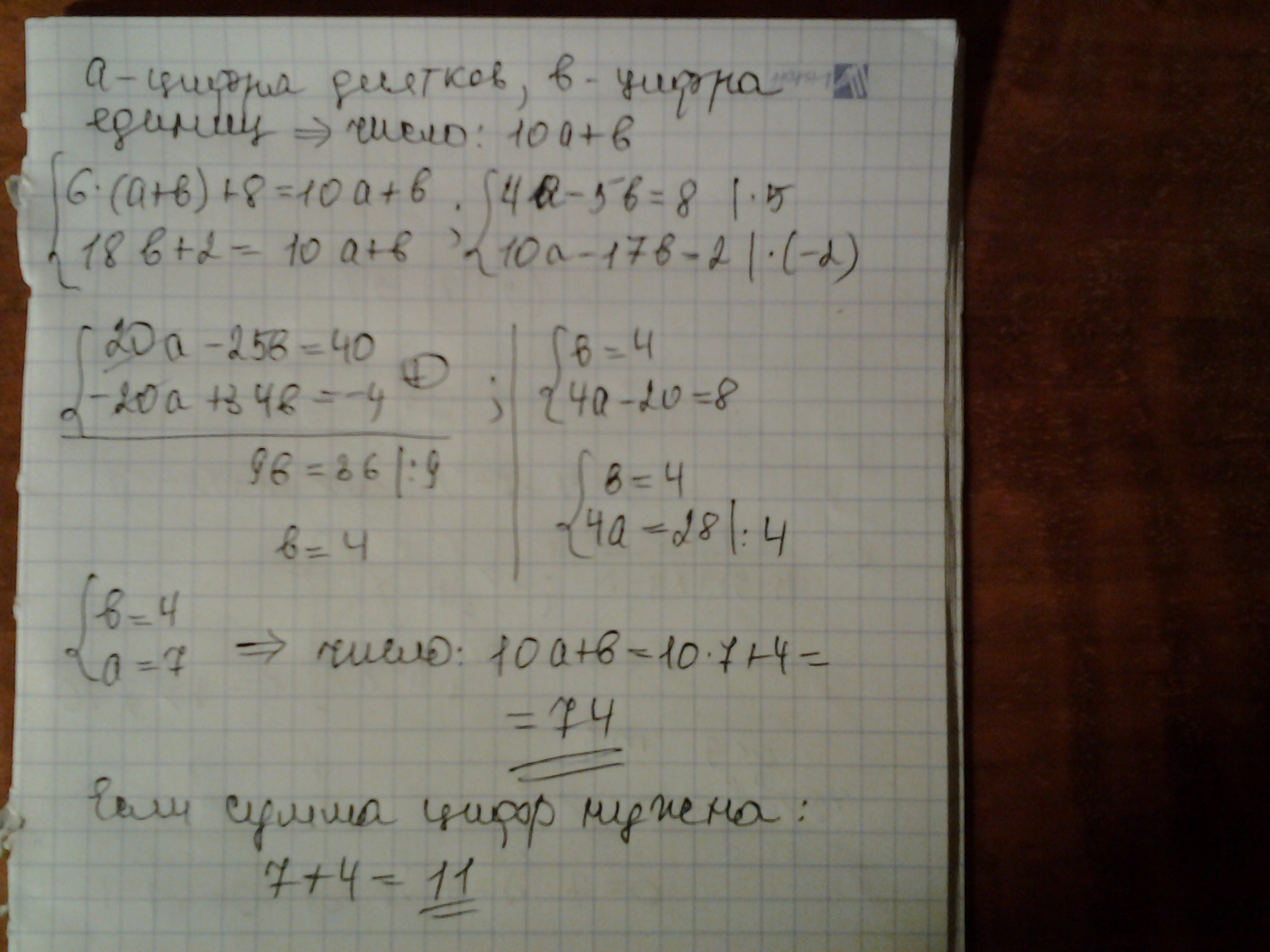 eсли двузначное число разделить на сумму его цифр то в частном получится 6 в остатке 8 если же это число разделить на цифру его единиц то в частном получится 18 а в остатке 2. чему равна сумма искомого числа