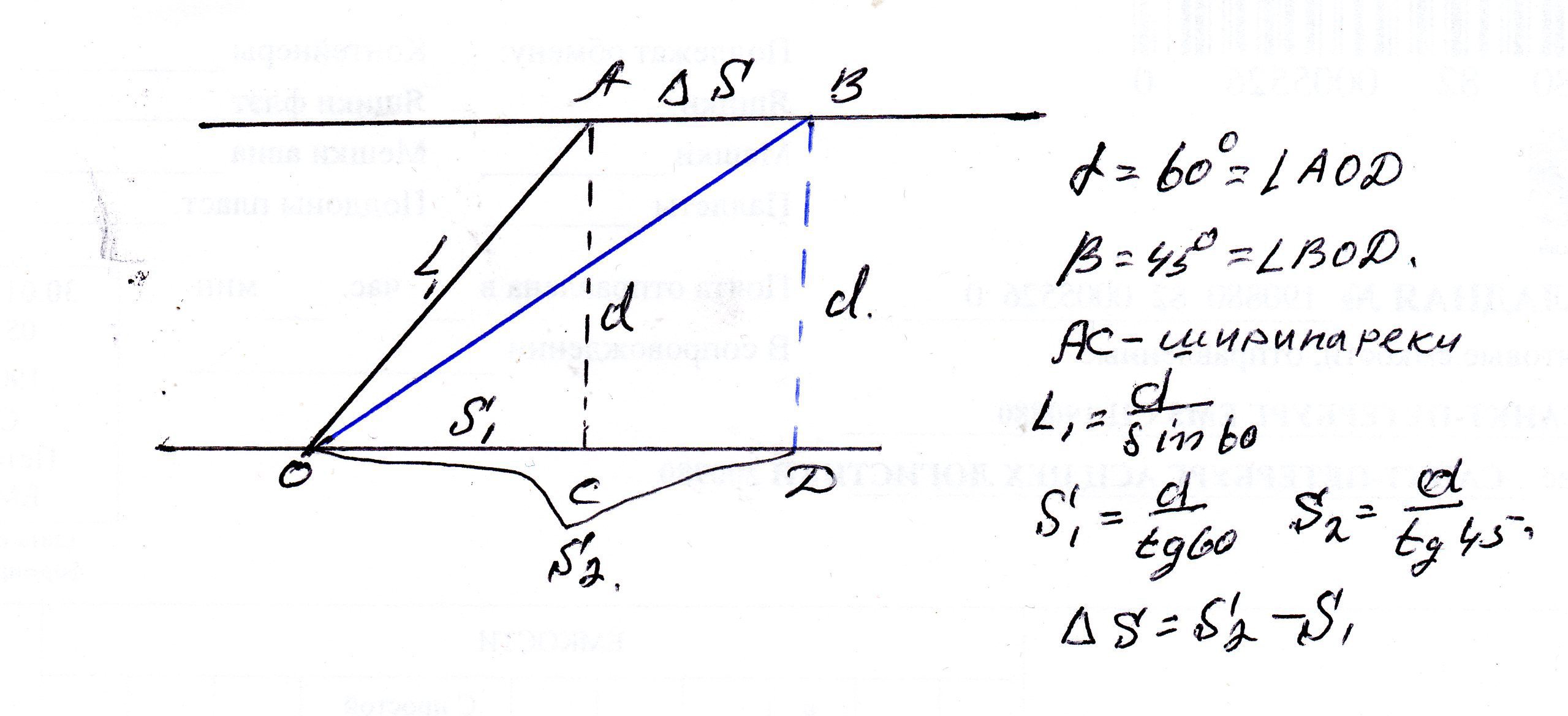 ΔS=d(1/tg60-1/tg45) ΔS=d(1/1.73+1/1) ΔS=74d/73 t=74d/73*0.5=2.03d
