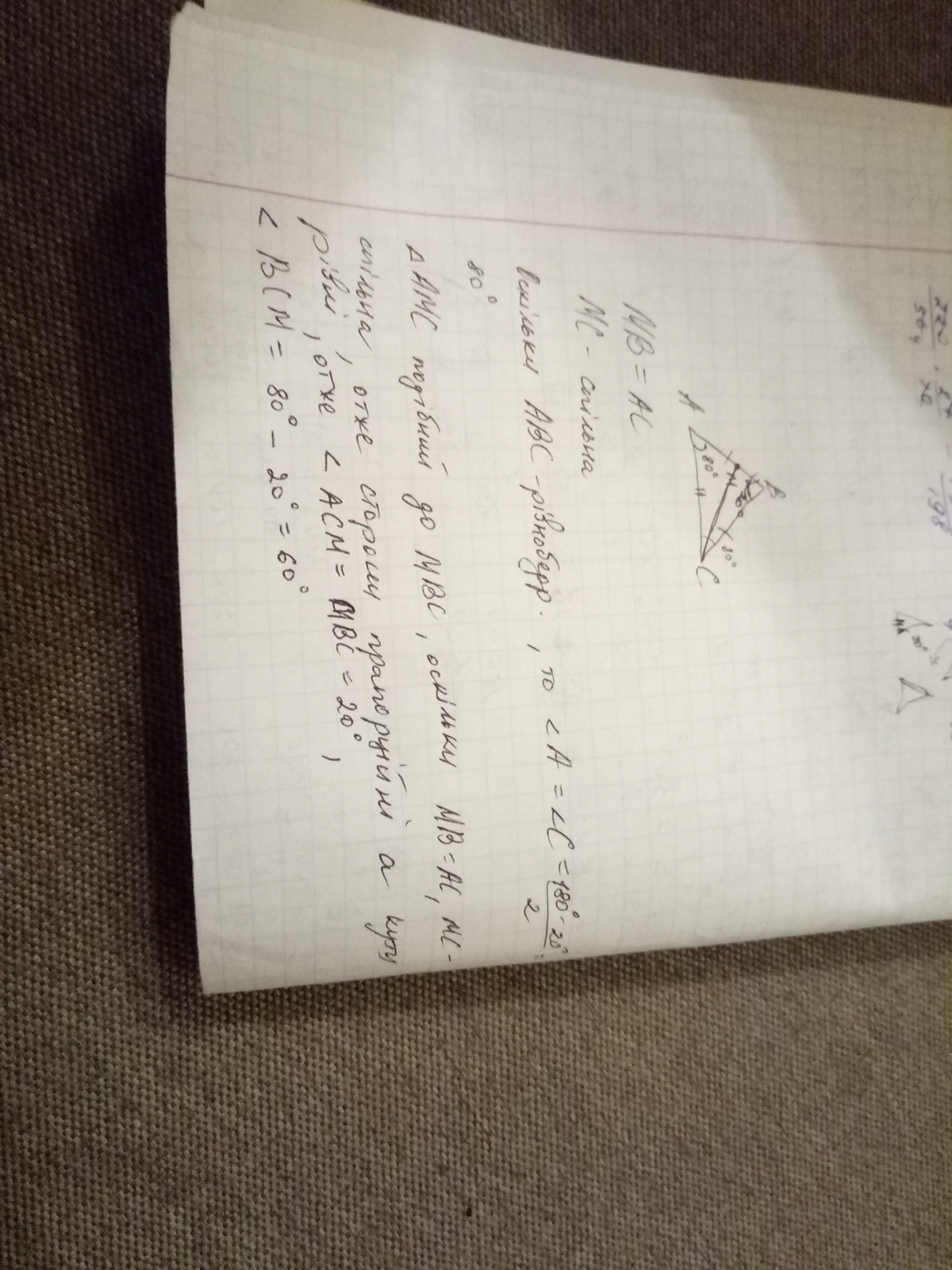Треугольник АВС равнобедренный, АВ=ВС. На стороне АВ взята точка М таким образом, что МВ=АС. Угол АВС = 20 градусам. Чему равен угол ВСМ?