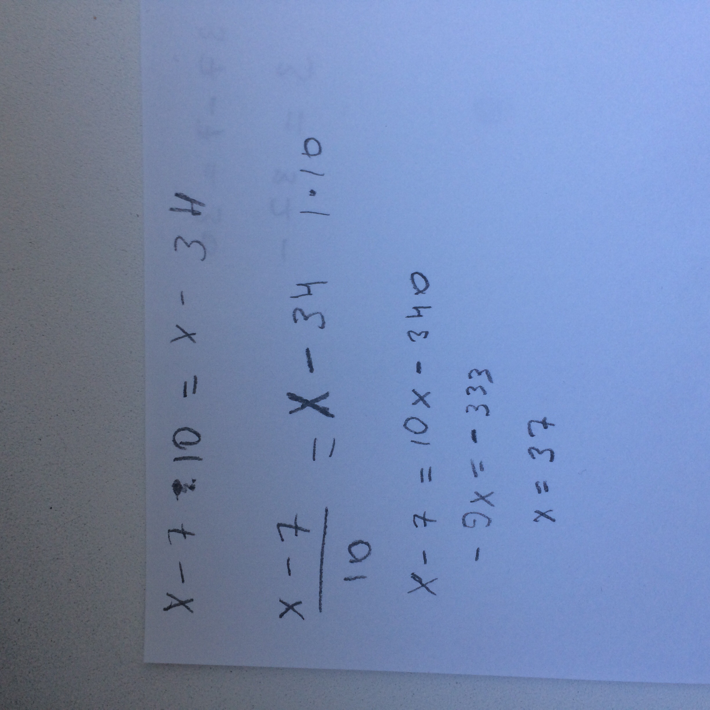 Ннкоторое число уменьшили на 7,потом уменьшили в 10раз и получили число, которое на 34 меньше исходного . найдите это число.