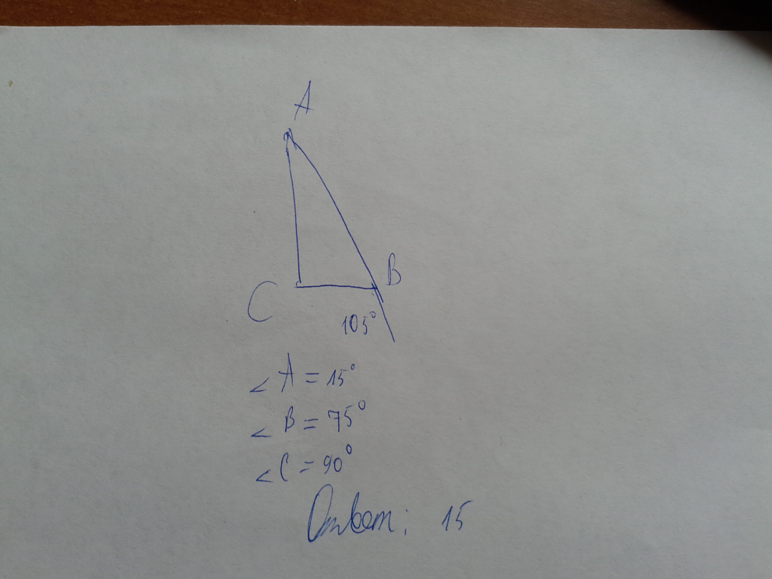 в прямоугольном треугольнике Один из внешних углов равен 105 градусов Найдите меньший из углов прямоугольного треугольника ответ дайте в градусах