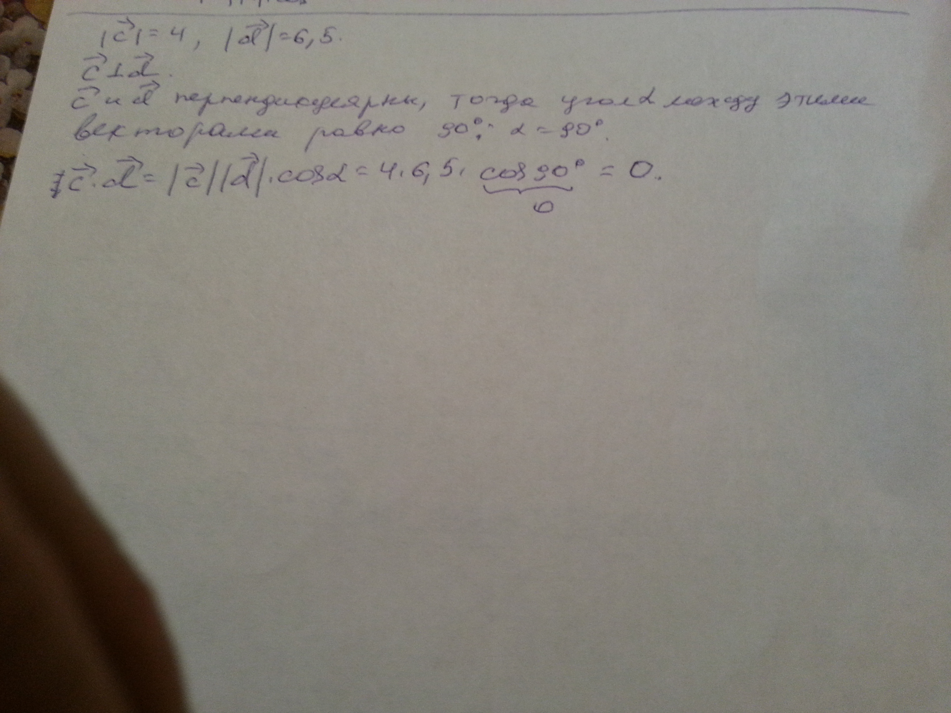 Векторы c и d перпендикулярны и c=4 и d=6,5 (c и d по модулю) найдите скалярное произведение векторов c и d