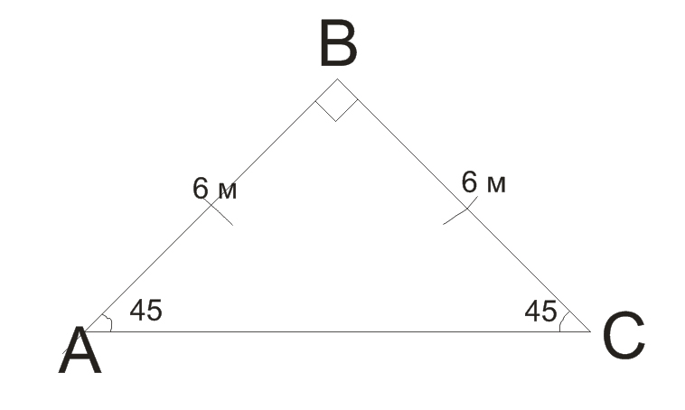 Дано: равнобедренный треугольник АВС, угол А=45, АВ=6 м