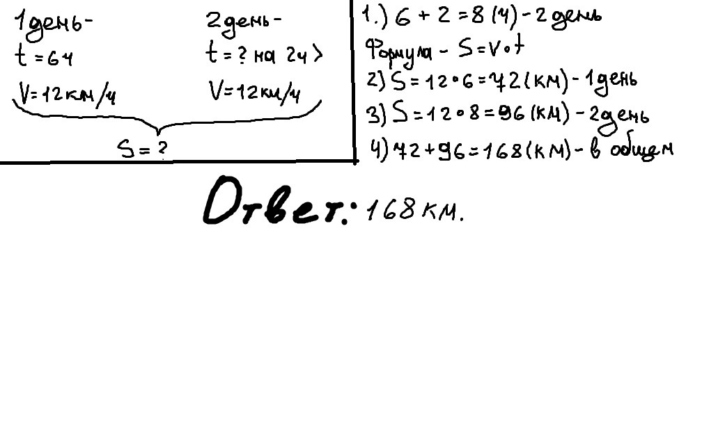 1) 6*12=72(км)-проехал за 6 ч. 2)6+2=8(ч)-проехал во второй день 3)8*12=96(км)-проехал во второй день 4) 72+96=168(км)-проехал за 2 дня. Ответ:168 км проделал велосипедист за 2 дня