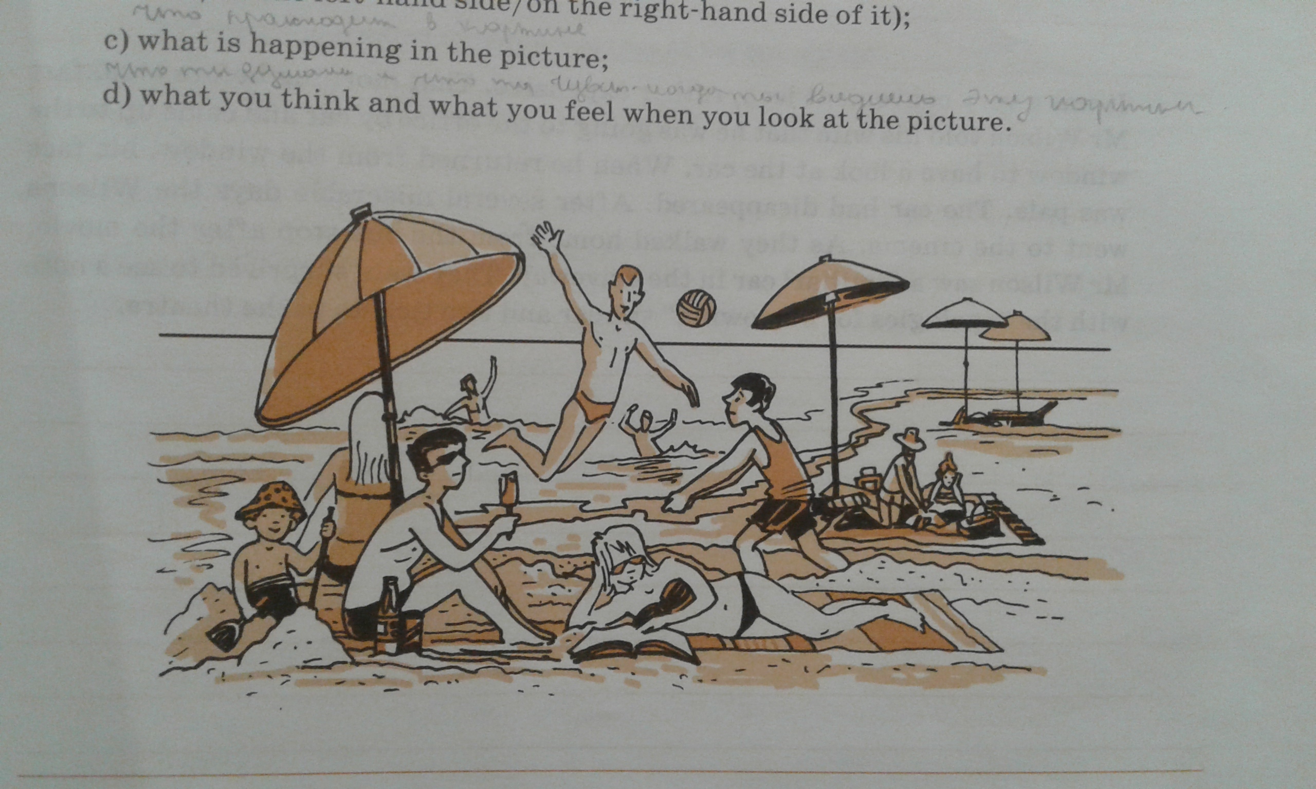 b) what and who you can see in the picture (in its centre/at the top/at the bottom/on the left-hand side/on the right-hand side of it);
